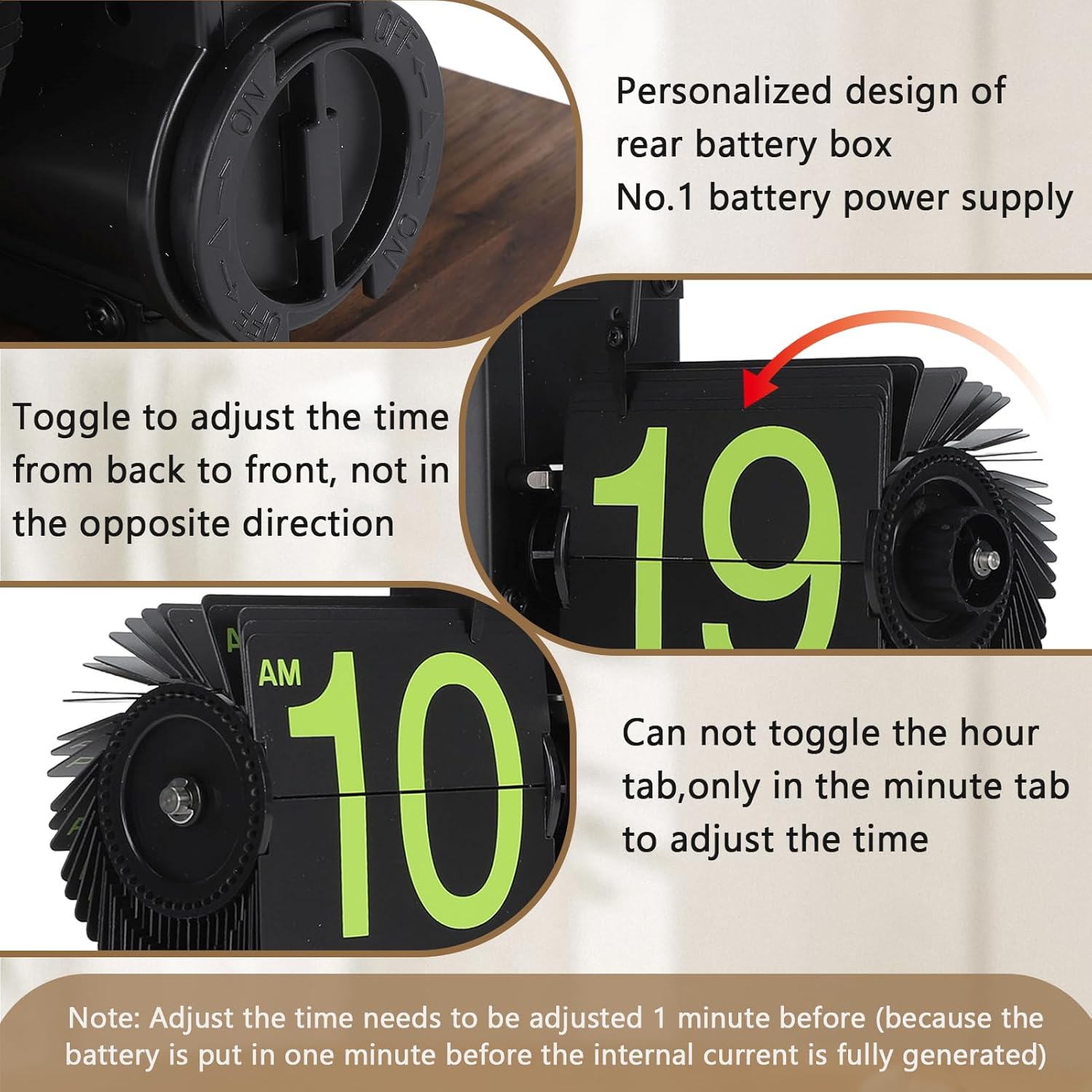 Flip Desk Clock, Retro Vintage Flip Desk Table Clock, Digital Sided Large Numbers Mechanical Flip Clock Wood Base for Living Room, Study Room and Office(Frosted Black)