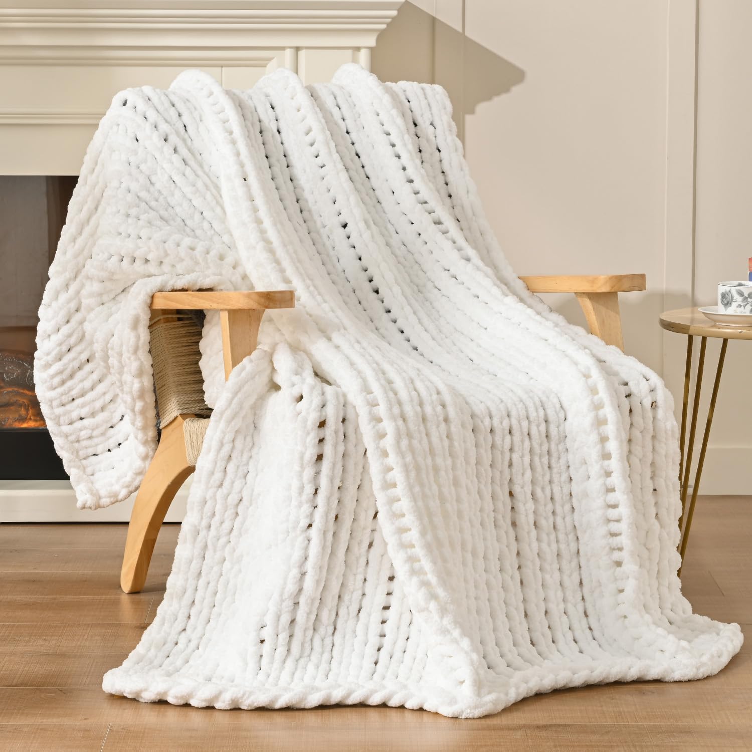Esterra 100% Hand Knitted Chenille Throw Blanket, 50"x60", White, Polyester, Chunky Knit, Throw Blanket, 50x60 Inches