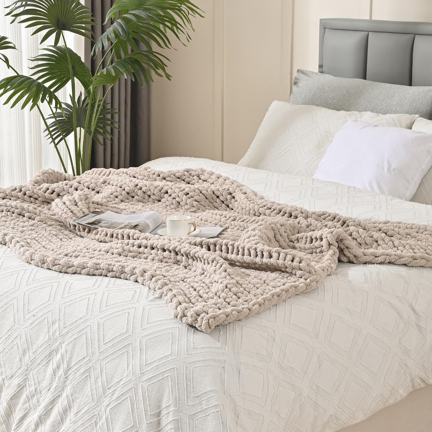Esterra Chunky Knit Blanket Throw 40"x50", 100% Hand Knitted Chenille Throw Blanket, Cozy Soft Thick Cable Knit Throw Large Rope Knot Crochet Throw Blanket for Sofa Couch Bed, Linen Beige