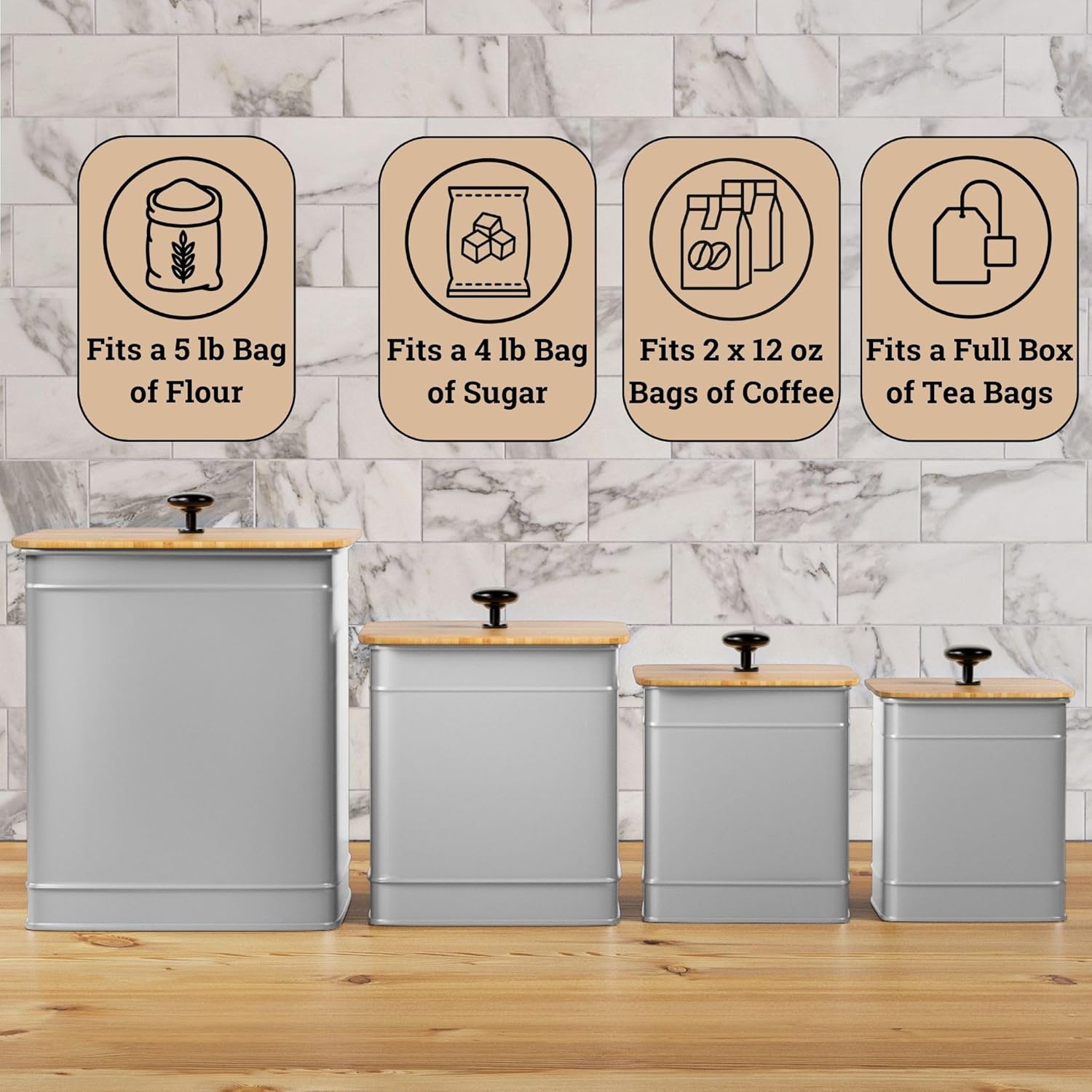 - DECORATIVE & FUNCTIONAL - Designed for display with a sleek matte gray powder coated finish and contrasting bamboo lids, these decorative kitchen jars match any decor from farmhouse to modern. Made of iron, these gray kitchen accessories are light and not breakable, but sturdy and designed to last, as well as being easy to hand wash.