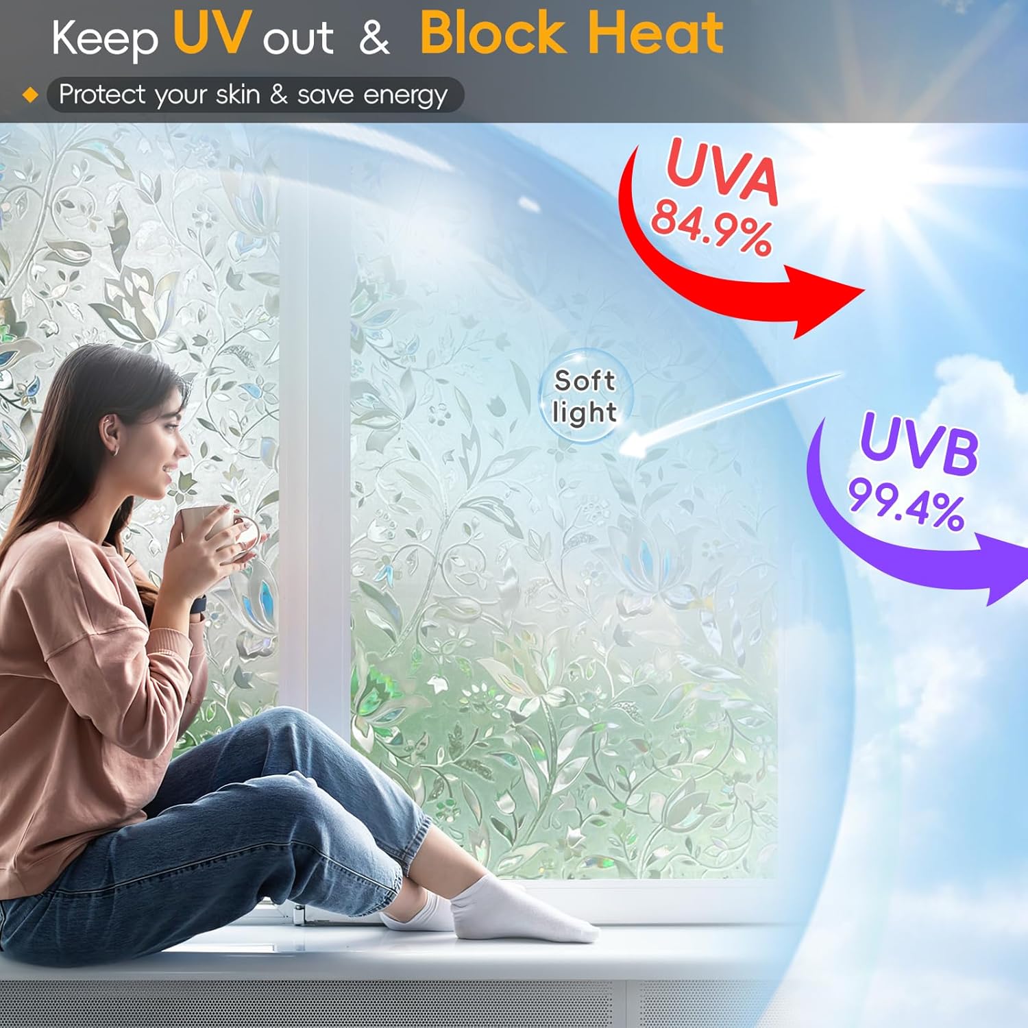 - UV Protection & Energy Saving: Window cling privacy film blocks up to 96% of uv rays. Suncatcher for window reduces most of glares, slowing down fading on flooring, furniture, and protect your beloved one’s skin. Iridescent window film can also cut energy bill up to 50% by rejecting up to 50-90% of total solar energy.