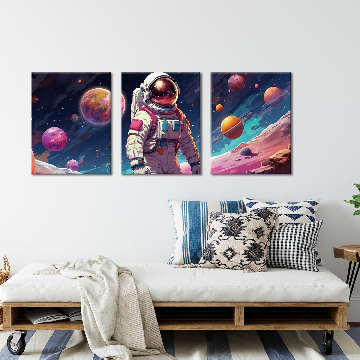 Outer Space Wall Art - Astronaut Spaceman Planets Canvas Prints Posters, Framed Artwork for Space Room Boys Bedroom Playroom Home Decorations, 3 Panels