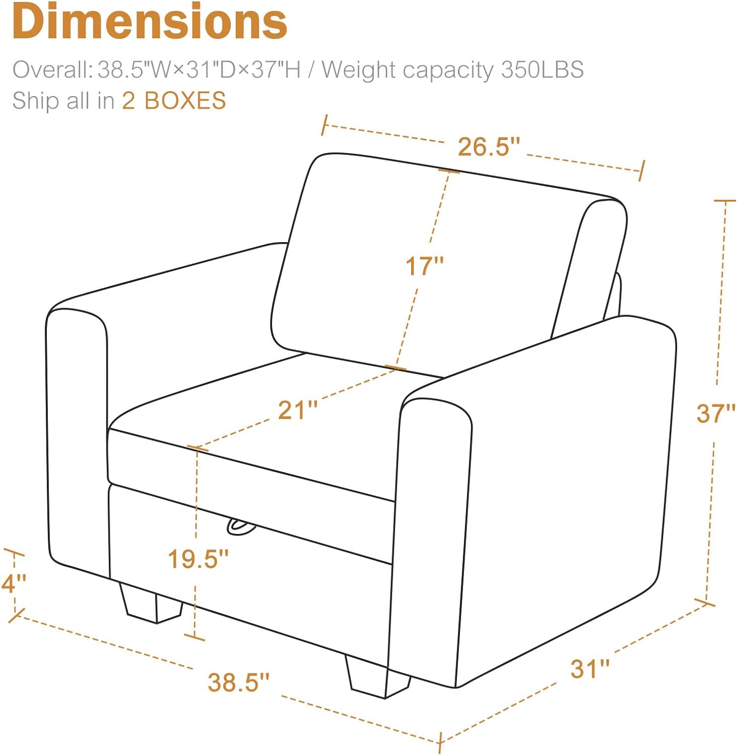 - ARMCHAIR WITH STORAGE:The modern accent chair has a hidden storage compartment large enough to hold blankets, books, cushions, CDs, or anything else you want to keep handy. This not only saves space but also helps keep your living room tidy. This multifunctional sofa can be easily rearranged to fit both small and spacious living rooms, bedrooms, playrooms, etc. Storage dimensions: 24.5''W x 25''D.