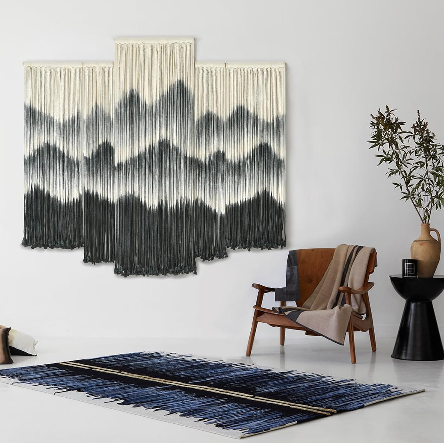 - Design: inspiration for natural themes: Handmade Dip-Dyed Macrame wall hanging wall decor living room mountain design inspiration for the mountain comes from the natural mountain landscape, so the patterns often present a natural, fresh, and primitive style, attracting people's longing and love for nature.