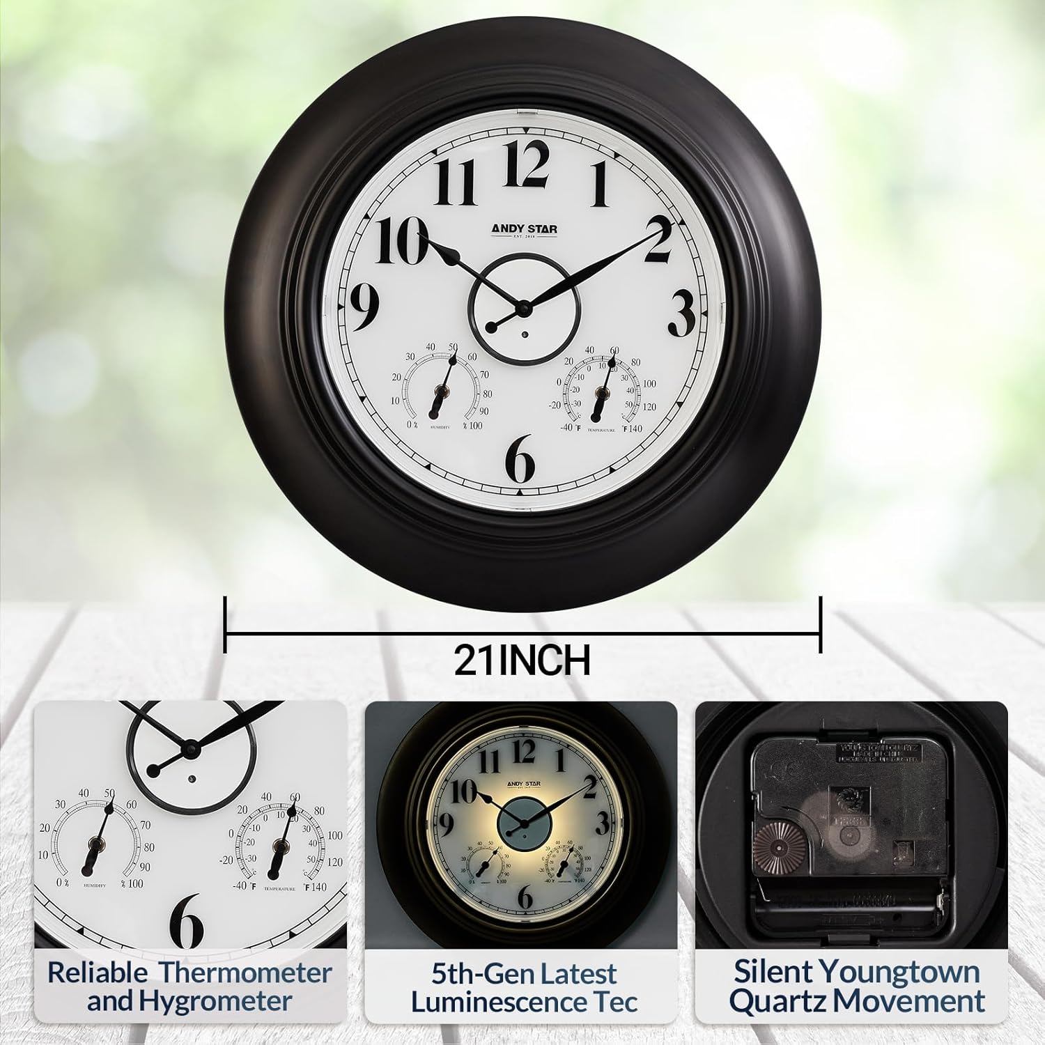Andy Star 21 Inch Large Illuminated Outdoor Wall Clock Waterproof with Thermometer and Hygrometer, Oversized Battery Wall Clock for Patio Pool, Oil Rubbed Bronze Silent Non Ticking Clock for Garden