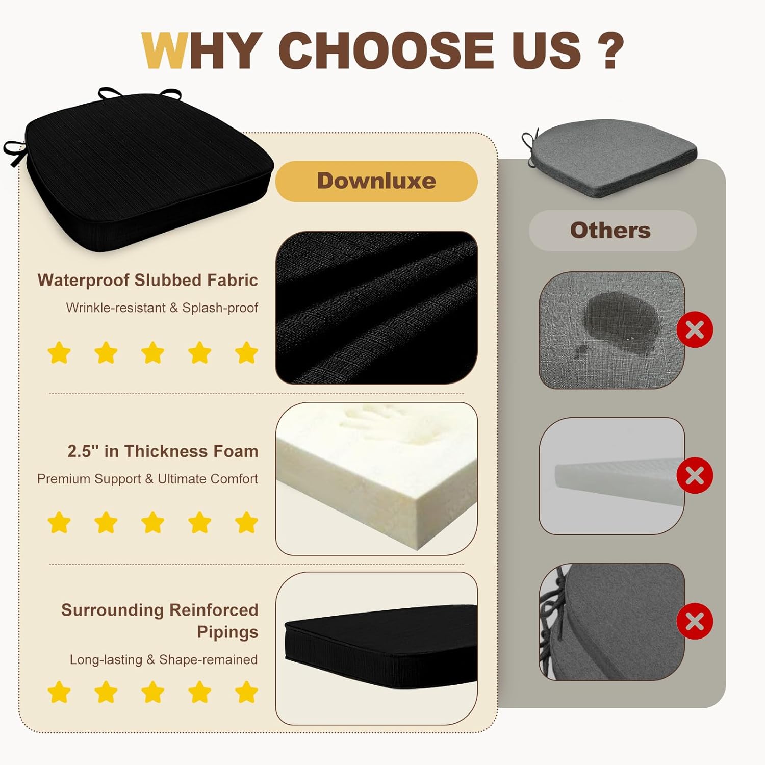 downluxe Chair Cushions for Dining Chairs, Waterproof Kitchen Chair Pads, Non-Slip Dining Seat Cushion with Ties, 17" x 16" x 2.5", Black, 6 Pack