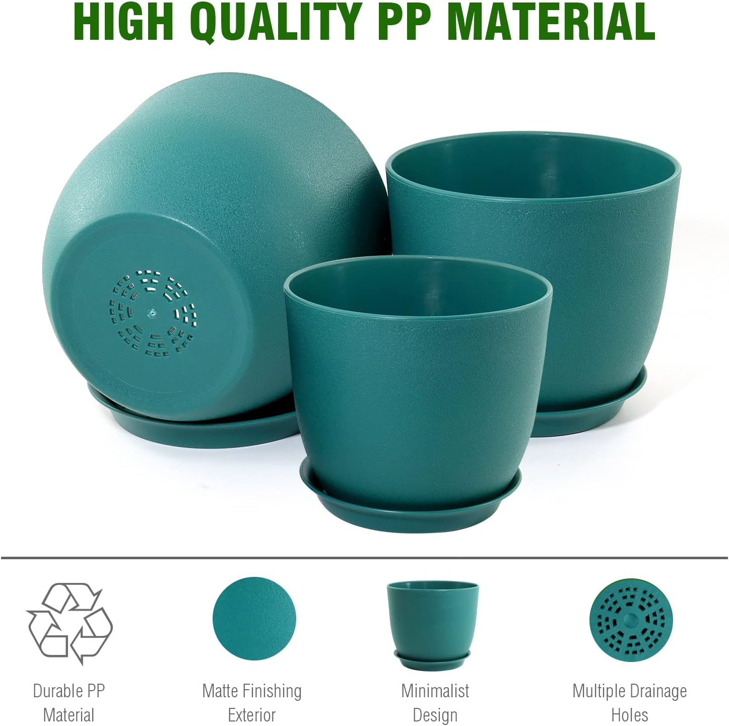 9/8/7.5 inch Flower Pots, 3 Pack Modern Plastic Planters with Drainage Holes and Trays for House Plants, Plant Pots for Indoor Outdoor Plants, Blue Green