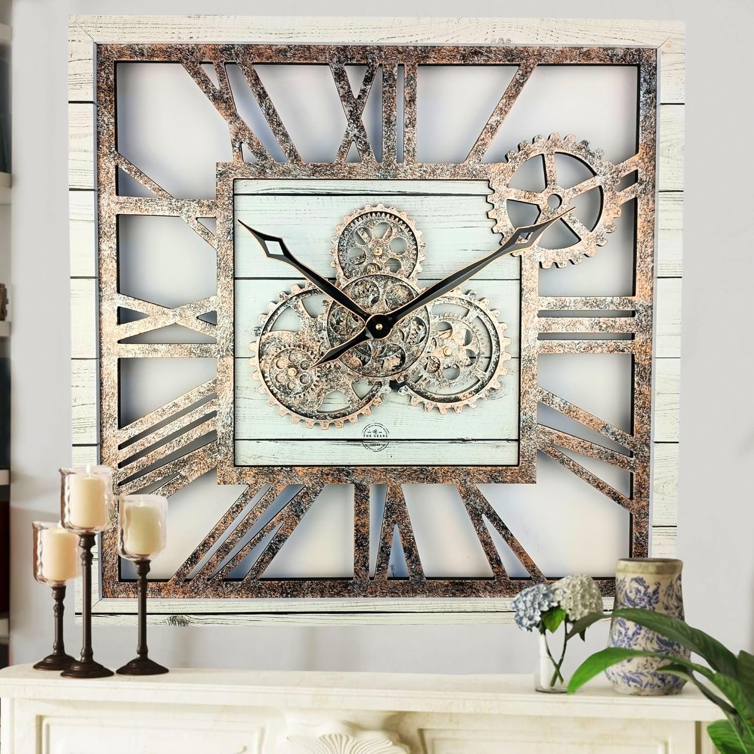 The Gears Clock 24'' Inch Square Real Moving Gear Wall Clock Vintage Industrial Oversized Rustic Farmhouse (White Farmhouse)