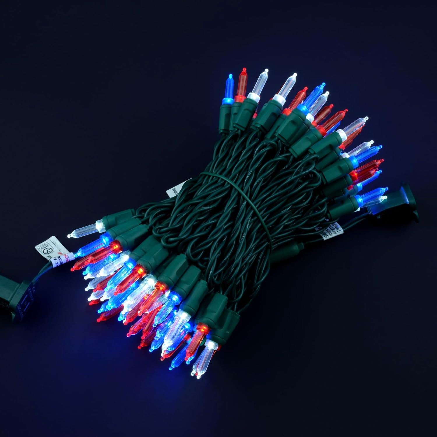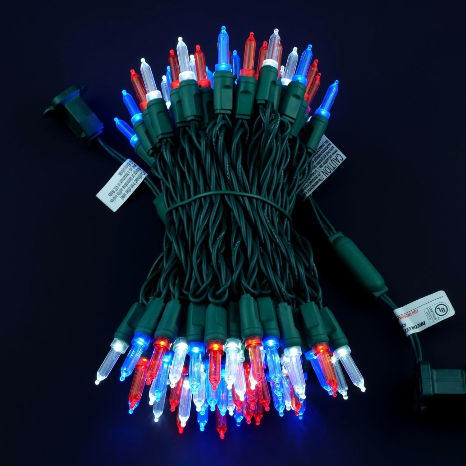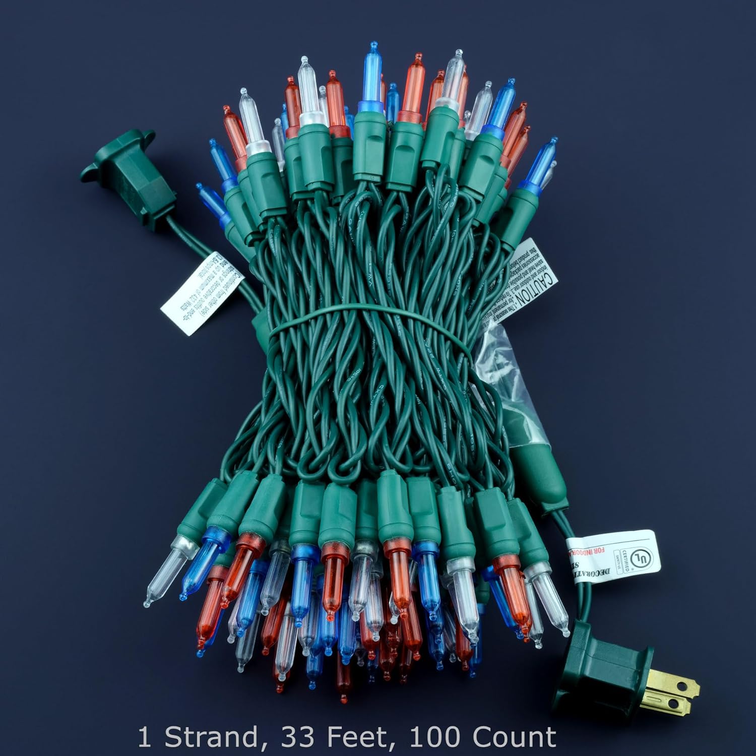 - SPECIFICATIONS β Each pack contains 1 strands of one-piece string lights, total length 33 feet with 100 count multicolor mini lights. Three colors of light bulbs are spaced out, they are red, white, and blue. 22 AWG green cord, 4" lead, 4" spacing, 4" tail.
