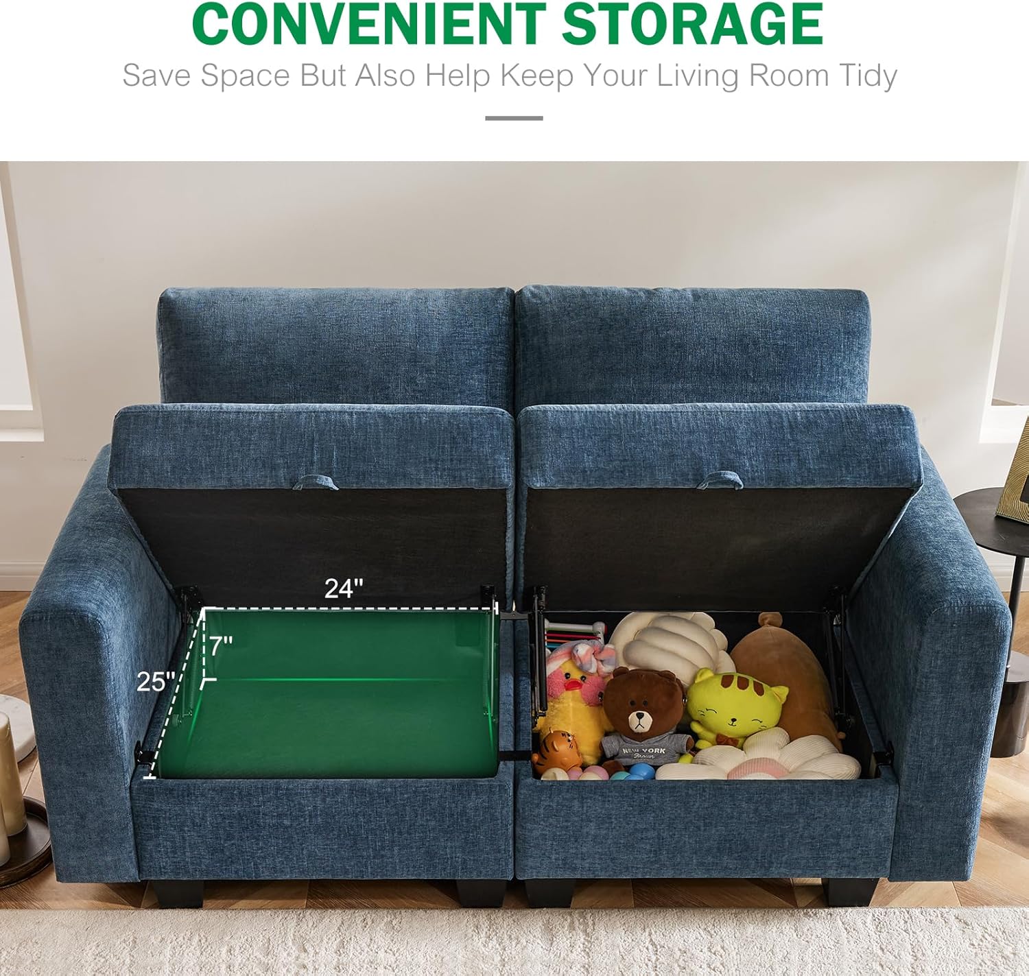 - ARMCHAIR WITH STORAGE:The modern accent chair has a hidden storage compartment large enough to hold blankets, books, cushions, CDs, or anything else you want to keep handy. This not only saves space but also helps keep your living room tidy. This multifunctional sofa can be easily rearranged to fit both small and spacious living rooms, bedrooms, playrooms, etc. Storage dimensions: 24.5''W x 25''D.