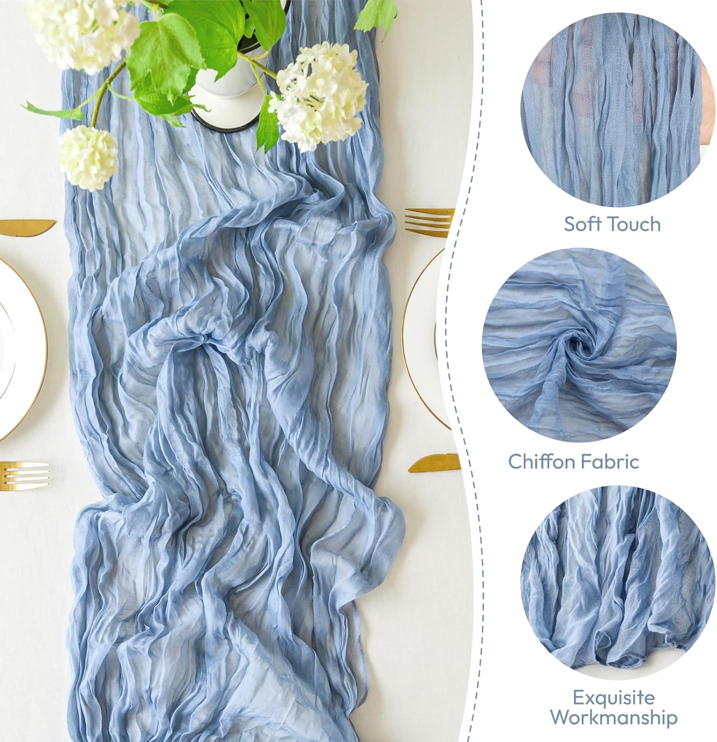 - 【Diversified Use】Boho cheesecloth Table Runner is necessary choice for beautifying tables. It's used for home decor, outdoor events, formal and informal setting in all seasons. Such as wedding decor, baby shower, bridal showers, parties, engagement banquet, Valentine's Day, Thanksgiving, Christmas.