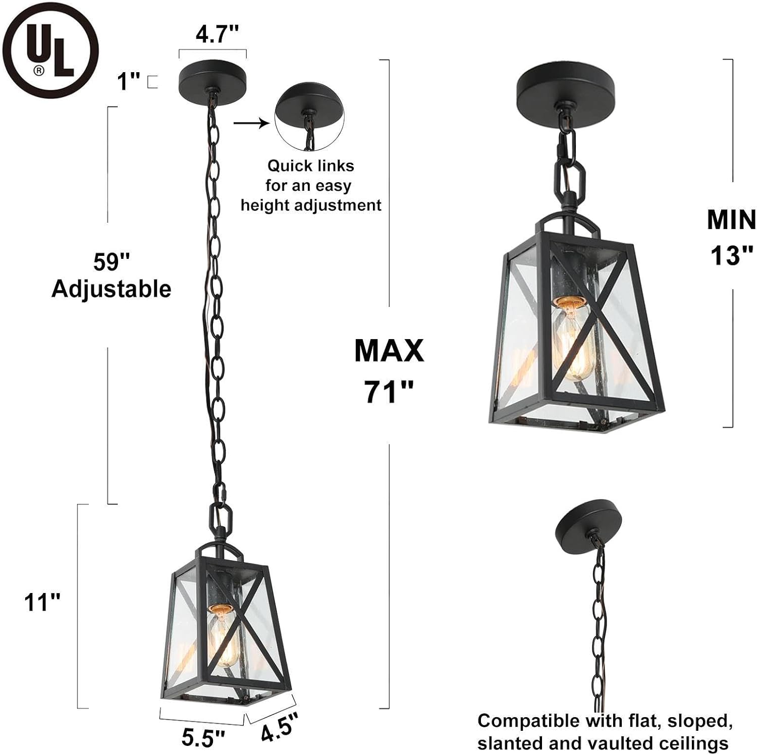 - Ideal Size & Suited Space: The gazebo hanging light size is 5.5” L x 4.5” W x 11” H.; The canopy size is 4.7" D x 1" H, which can cover the standard junction box. Sloped and vaulted ceilings are compatible. Equipped with a 59" adjustable hanging chain, this outdoor porch light can be hung from Min 11" to Max 71". With its classic design, it adds a sense of modern farmhouse feeling to porches, garages, gazebos, yards, and gardens. Also suited to indoor places, like the kitchen island or hallway.