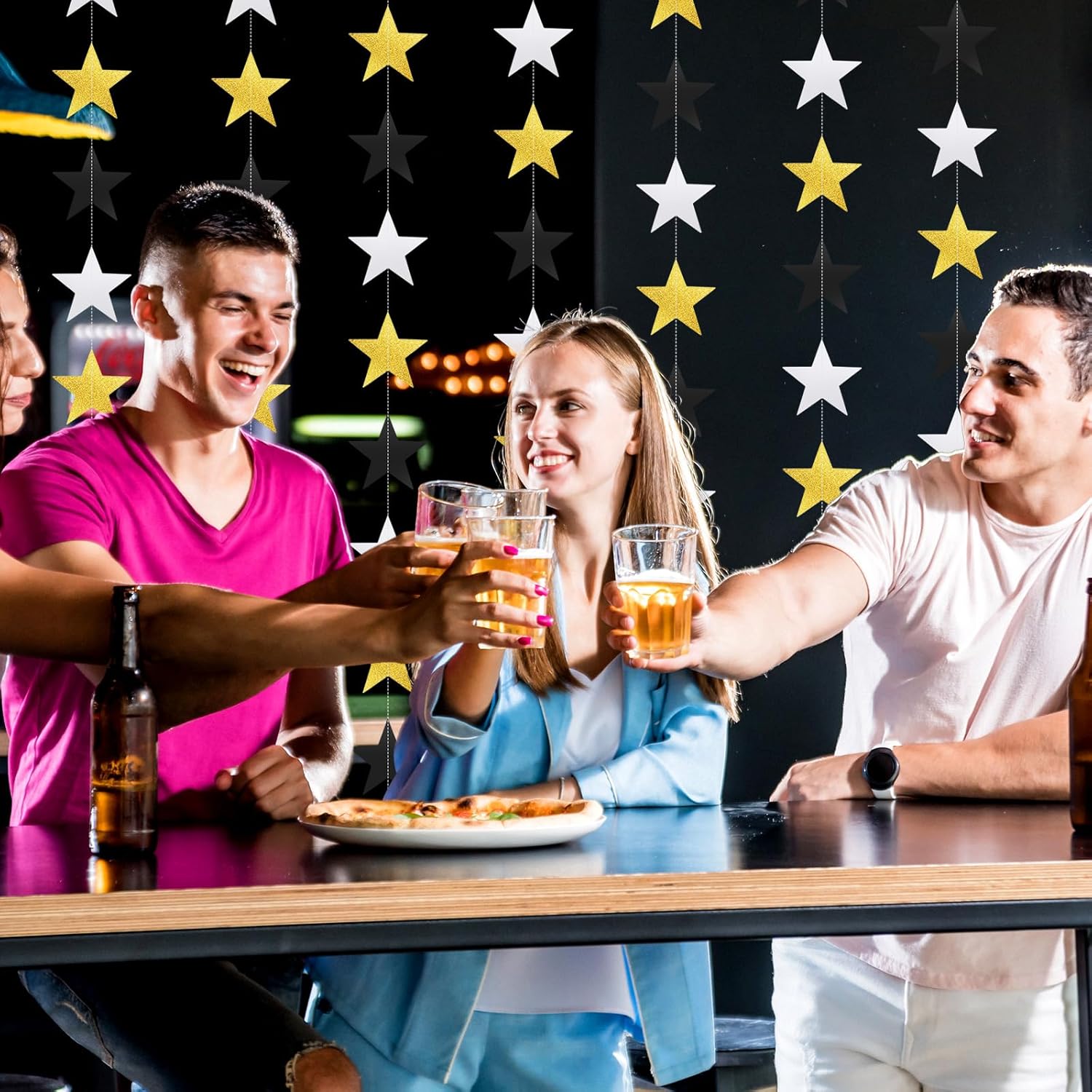 Patelai Glitter Star Garland Banner Decor 130 Feet Star Hanging Bunting Banner Twinkle Backdrop for Homecoming Classroom Wedding Birthday Halloween Christmas Party Supplies(Silver Gold Black)