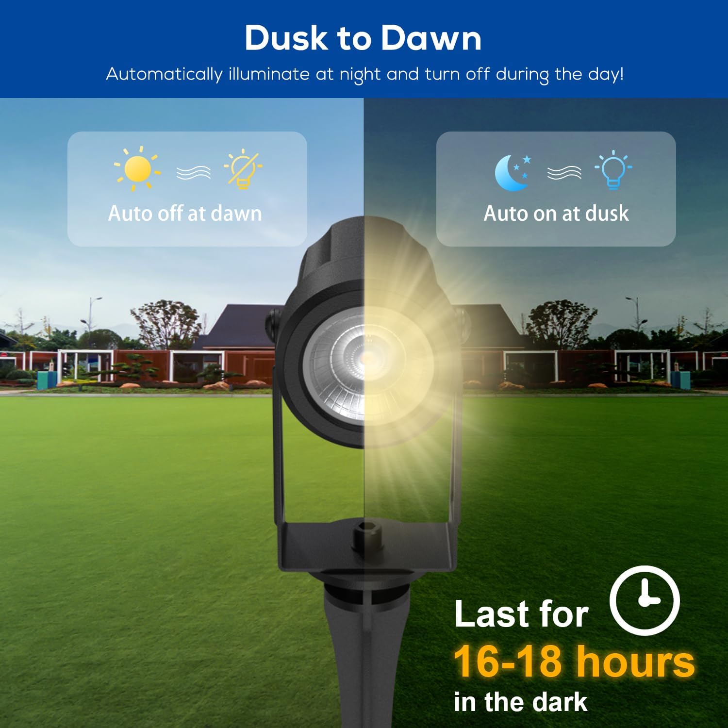 - 【Automatic On/Off & Adjustable Length】Equipped with Light Sensors, outdoor solar powered spot lights for yard garden automatically turn on at Dusk and off at Dawn. No need for manual operation, providing convenience and peace of mind. Providing an optional 13FT (2x6.5ft) Extension Cable (Sold Separately, ASIN: B0D174SZZ3 ).