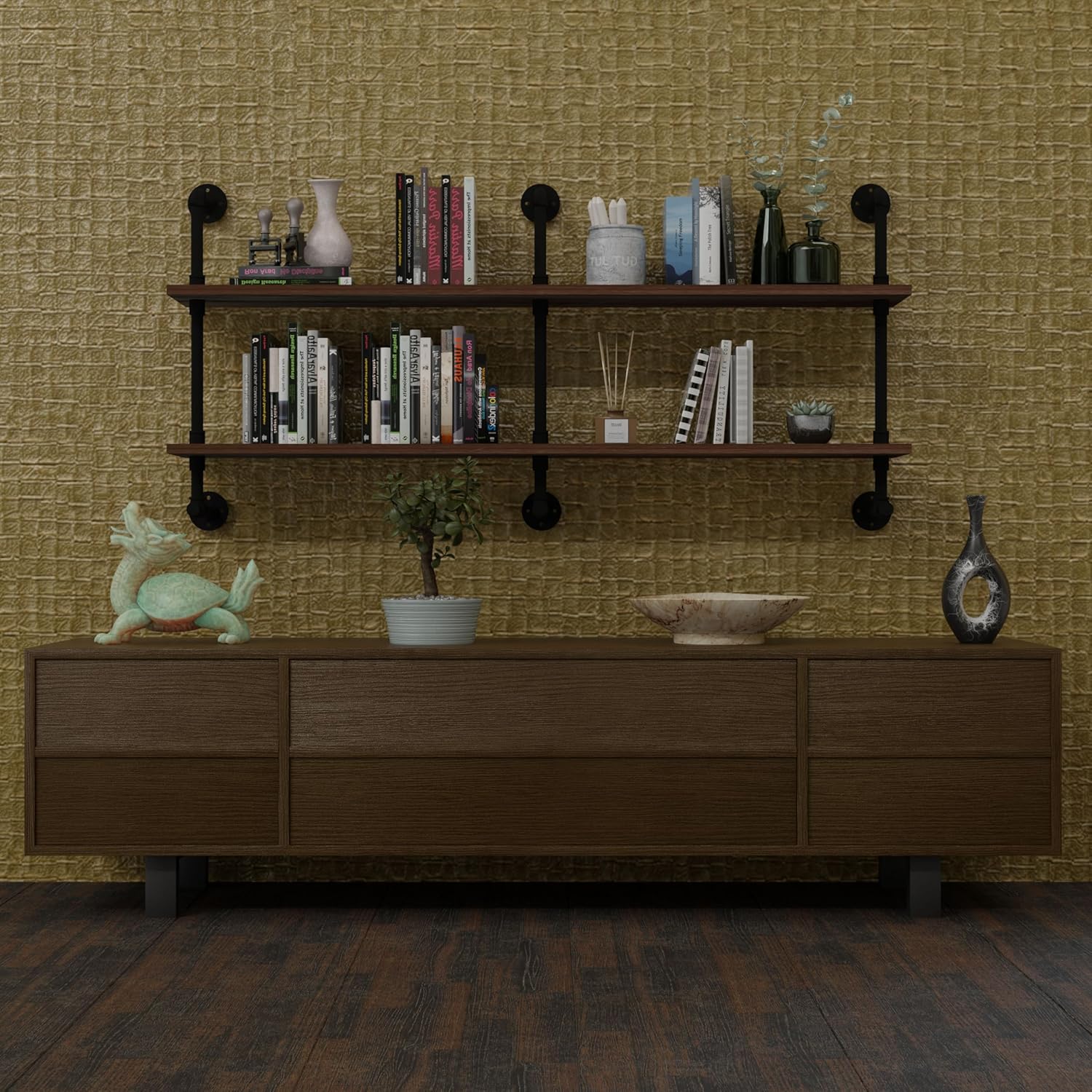 - 【Multiple Place Use】This 60 inch floating shelves for wall has a unique water pipe design. This long wall shelves can be used as a kitchen rack to place oil and salt sauce cans, as a floating bookshelves for wall in the farmhouse or living room or as wine rack in the bar.,any other where you want to install.