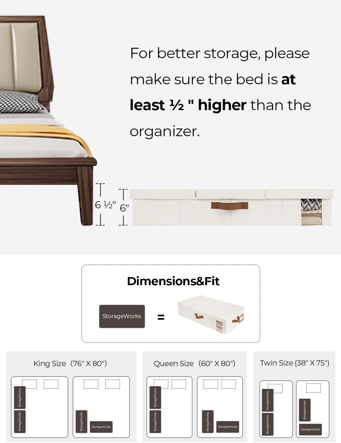- Large Capacity: With dimensions of 33 x 17 x 6 inches, the under bed storage containers offer ample space for storing a range of items, including clothes, blankets, bedding and shoes, maximizing your underbed storage space and organizing your bedroom. Please make sure that your bed is at least 6.5 inches high for better use.