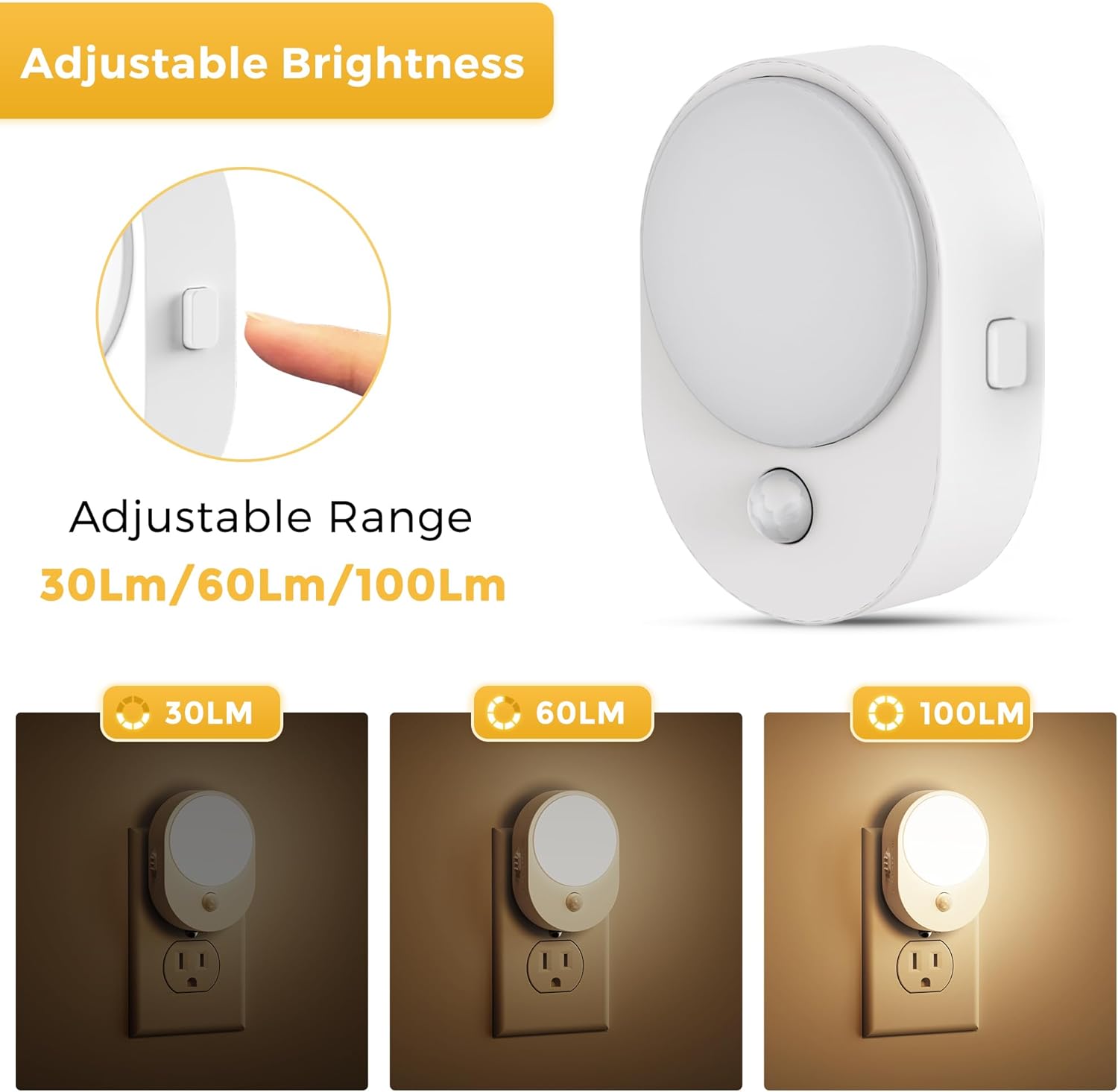 - Adjustable Brightness: The dimmable night light comes with 3 different levels(30LM/60LM/100LM) of brightness control settings.