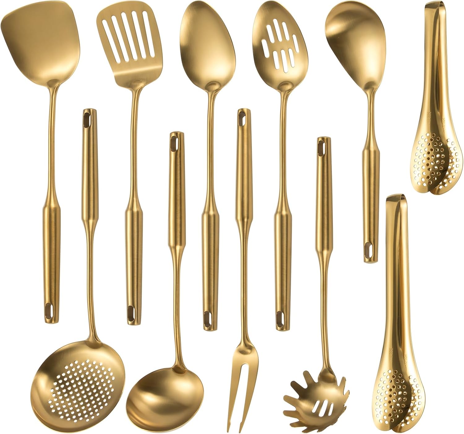304 Stainlss Steel Matte Kitchen Utensils Set, 11 Pcs Long Metal Cooking Utensil Gadgets Tools Set with Spatula, Spoon, Ladle, Skimmer, Tunner, Pasta Server, Tongs(Gold, Dishwasher Safe)