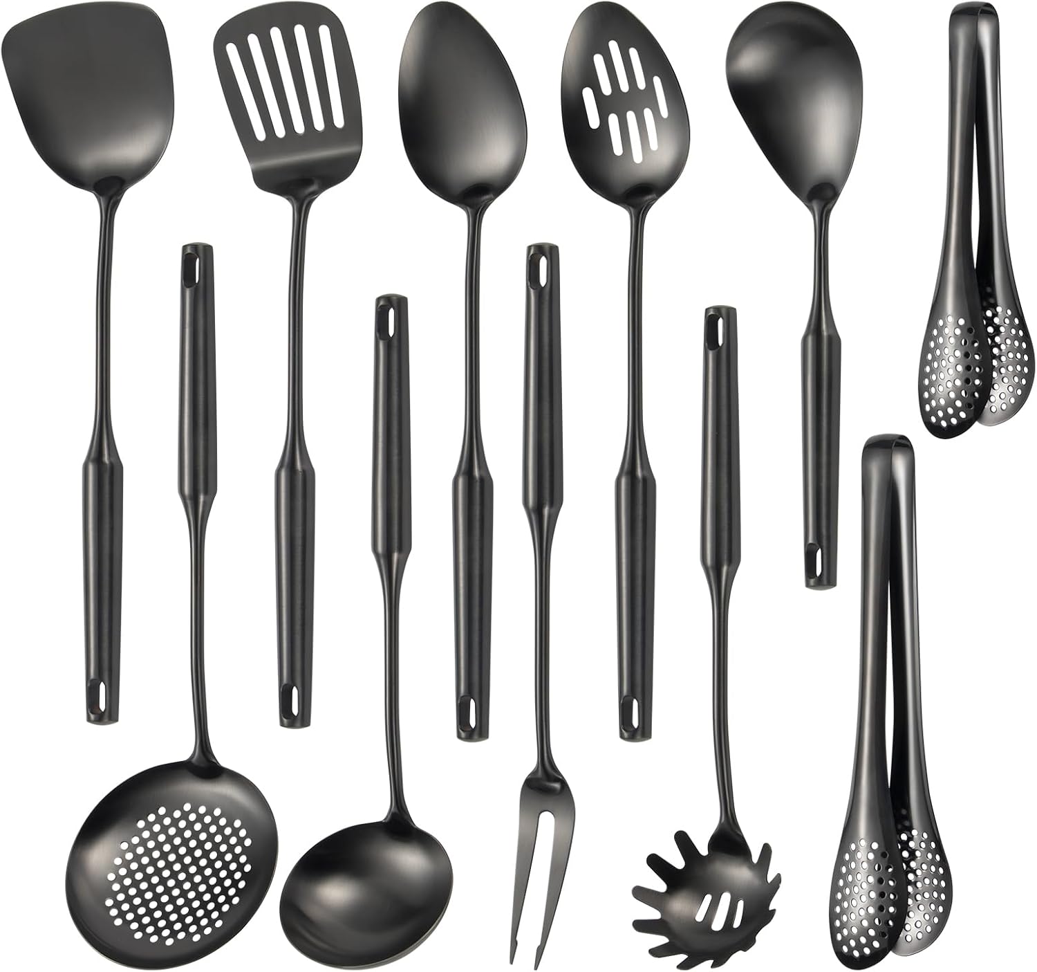 304 Stainlss Steel Matte Kitchen Utensils Set, 11 Pcs Long Metal Cooking Utensil Gadgets Tools Set with Spatula, Ladle, Spoon, Ladle, Skimmer, Tunner, Pasta Server, Tongs(Black, Dishwasher Safe)