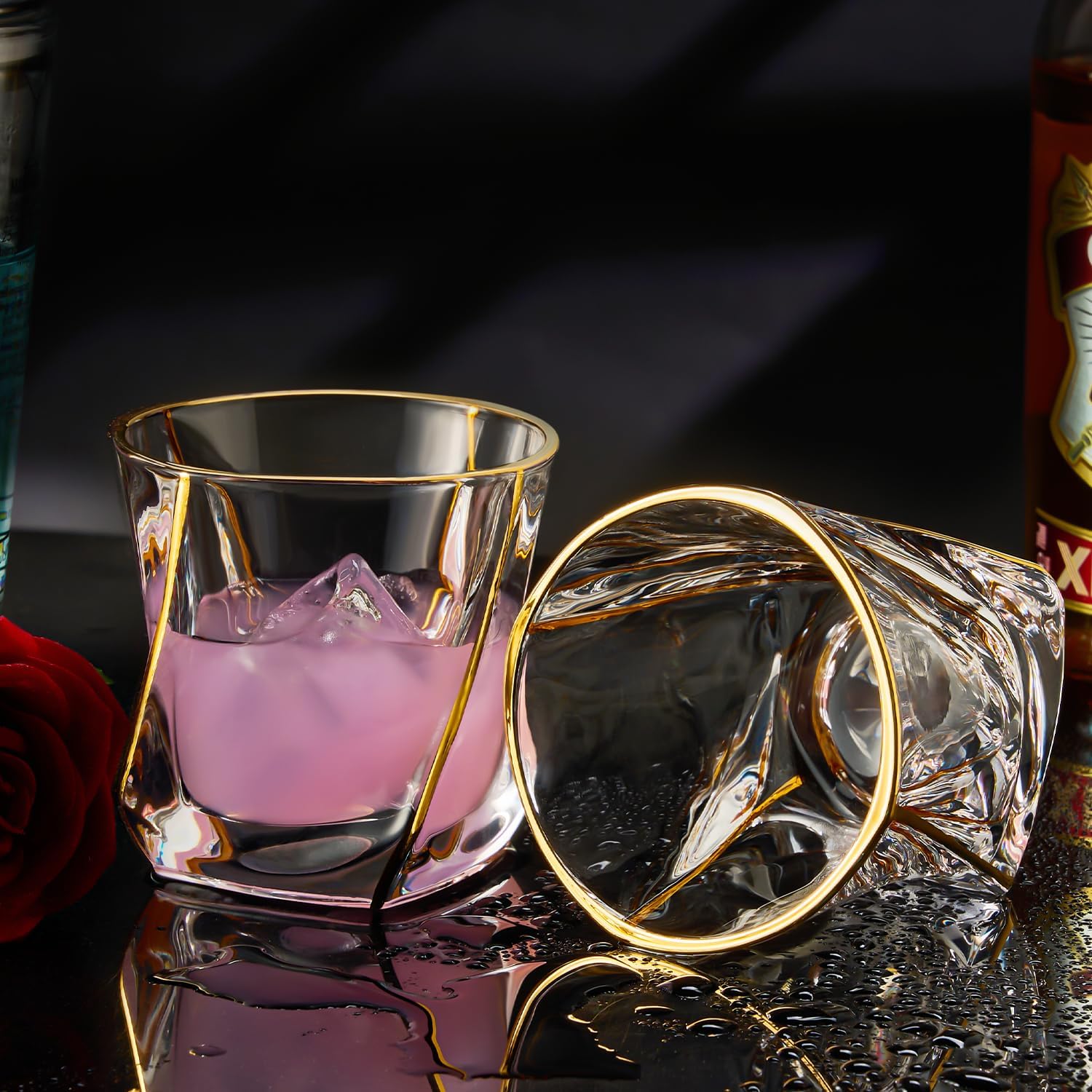 Crystal Whiskey Glasses Set of 2 with 24K Gold Rim,Bar Glasses,Twisted Whiskey Glass Gold Collection for Bourbon,Scotch and Wine,Rock Barware for Men Gift - 8oz