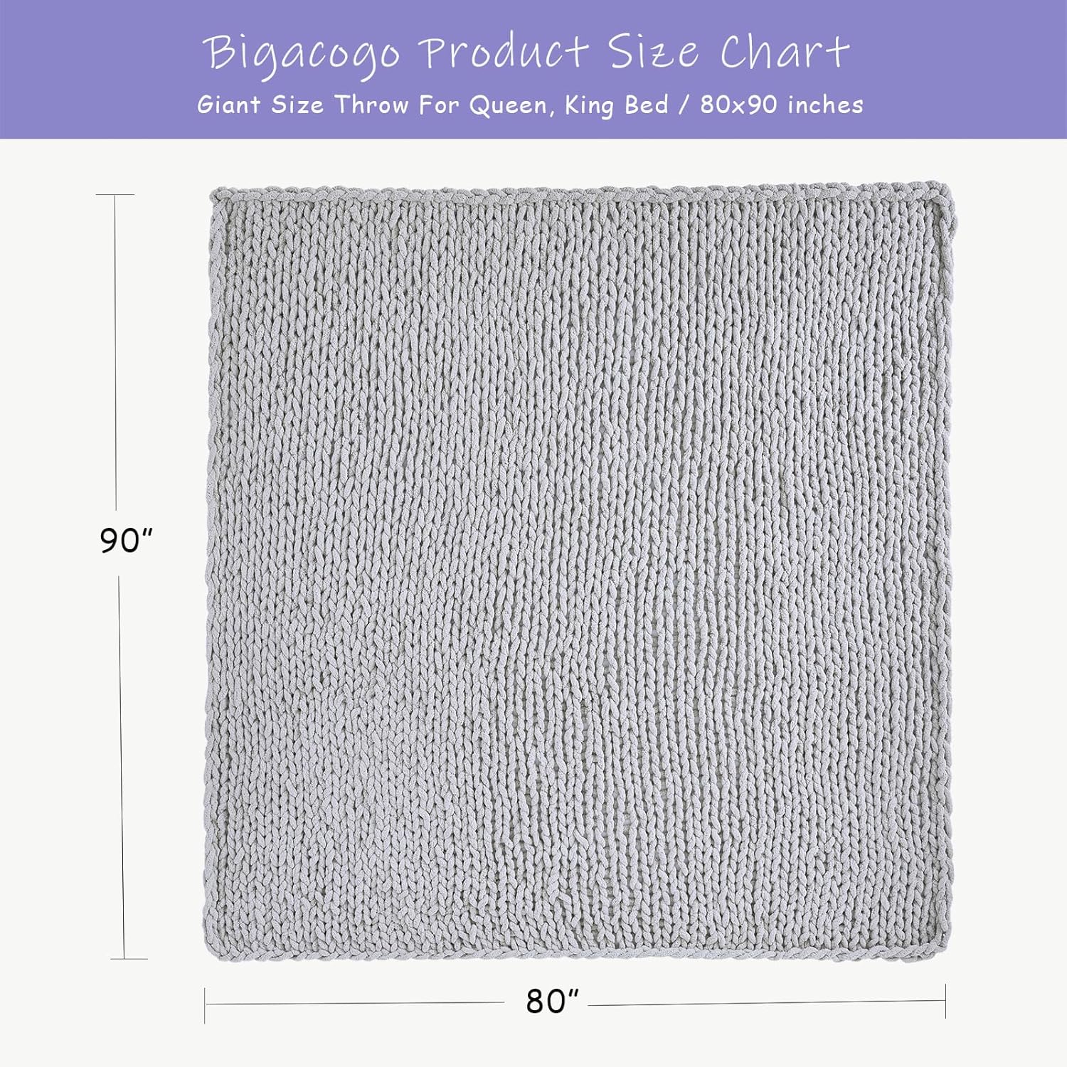 Bigacogo Chunky Knit Throw Blanket for Couch, 80x90 inches, 100% Hand Knitted with Thick Jumbo Chenille Yarn, Cozy Soft Large Rope Knot Cable Crochet Blankets for Sofa Bed Living Room, Light Grey