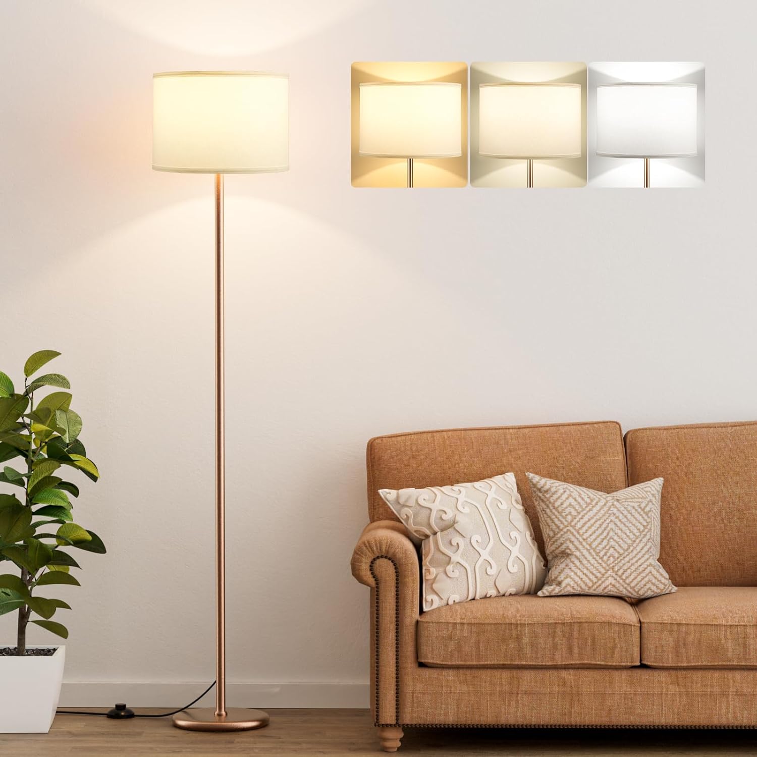 Ambimall 60'' Modern Floor Lamp with Shade, Tall Lamps for Living Room, Bedroom, Office, Dining Room, White Shade with Brown Pole(Without Bulb)