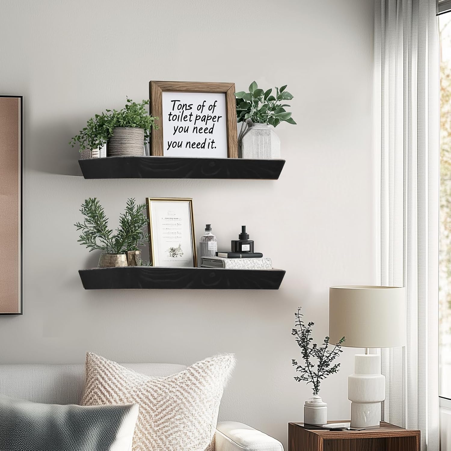 16"x6.8"x1.6" Slanted Floating Wall Shelves 2-Pack - Rustic Black Finish, Heavy-Duty Solid Wood Design with Hidden Brackets - Perfect for Living Room, Kitchen, Bathroom, or Office