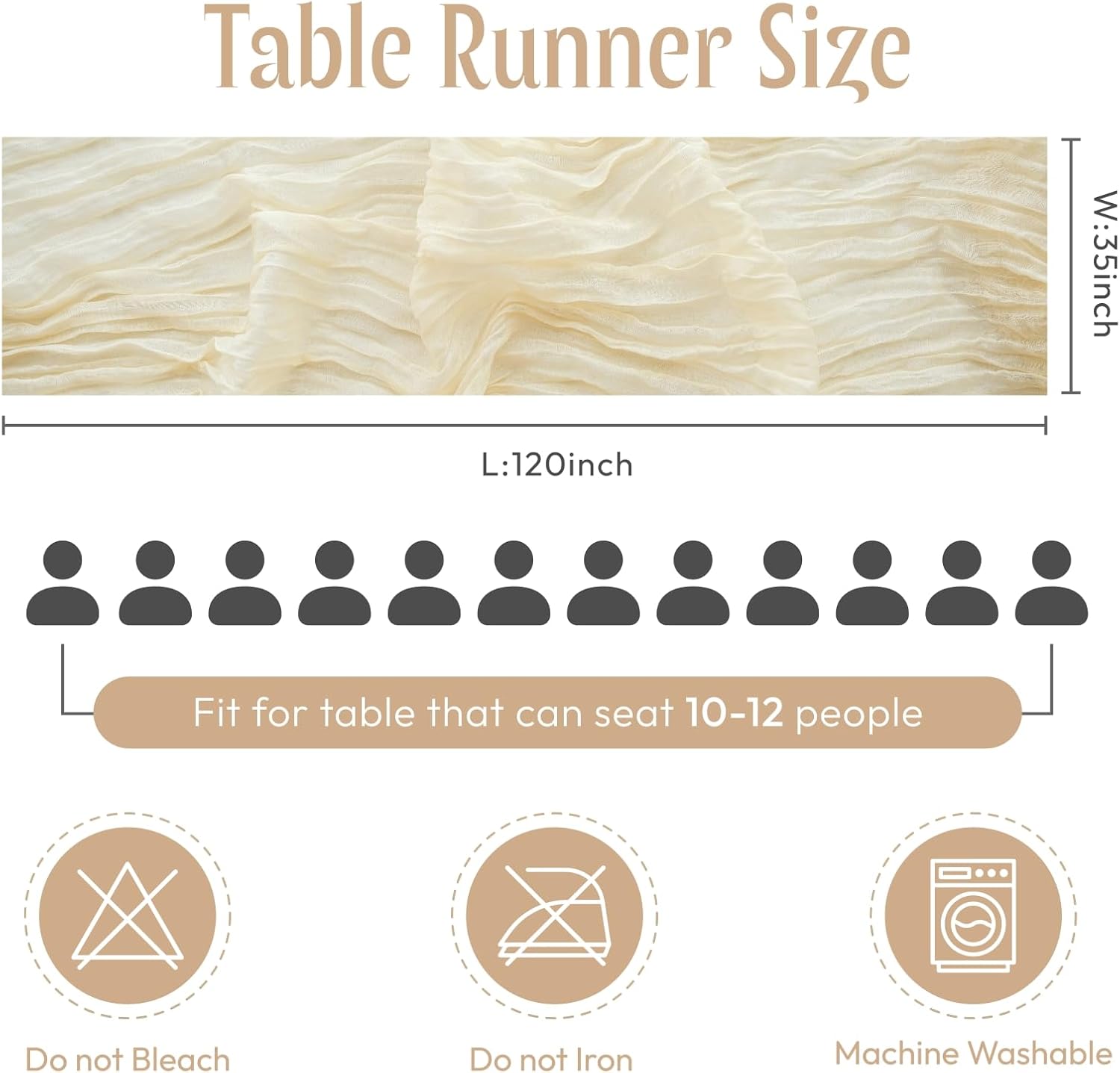 - 【Package Includs】1pcs Cheesecloth table runner (35" W x 120" L), neatly packed in a transparent plastic bag. This versatile table runner is specifically designed to fit most types of tables.