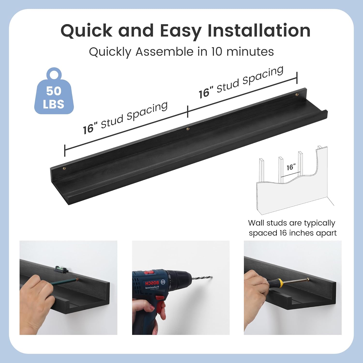 Picture Ledge Shelf for Wall, 36 inch Solid Pine Wood Nursery Book Shelves 2 Packs, Floating Ledge Shelves for Kids' Room Bedroom Bathroom Living Room Photo Frames Office Nursey Wall Decor, Black