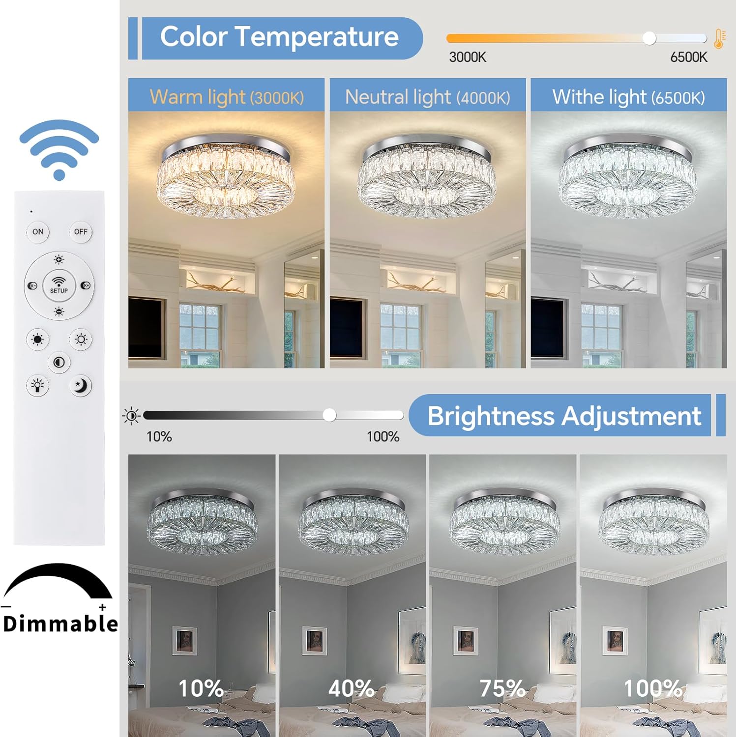 16.5 Inch Dimmable Chandelier with Remote Control LED Crystal Chandelier Modern Flush Mount Ceiling Light Fixtures for Living Room Bedroom Dining Room Entrance (dimmable-16.5")