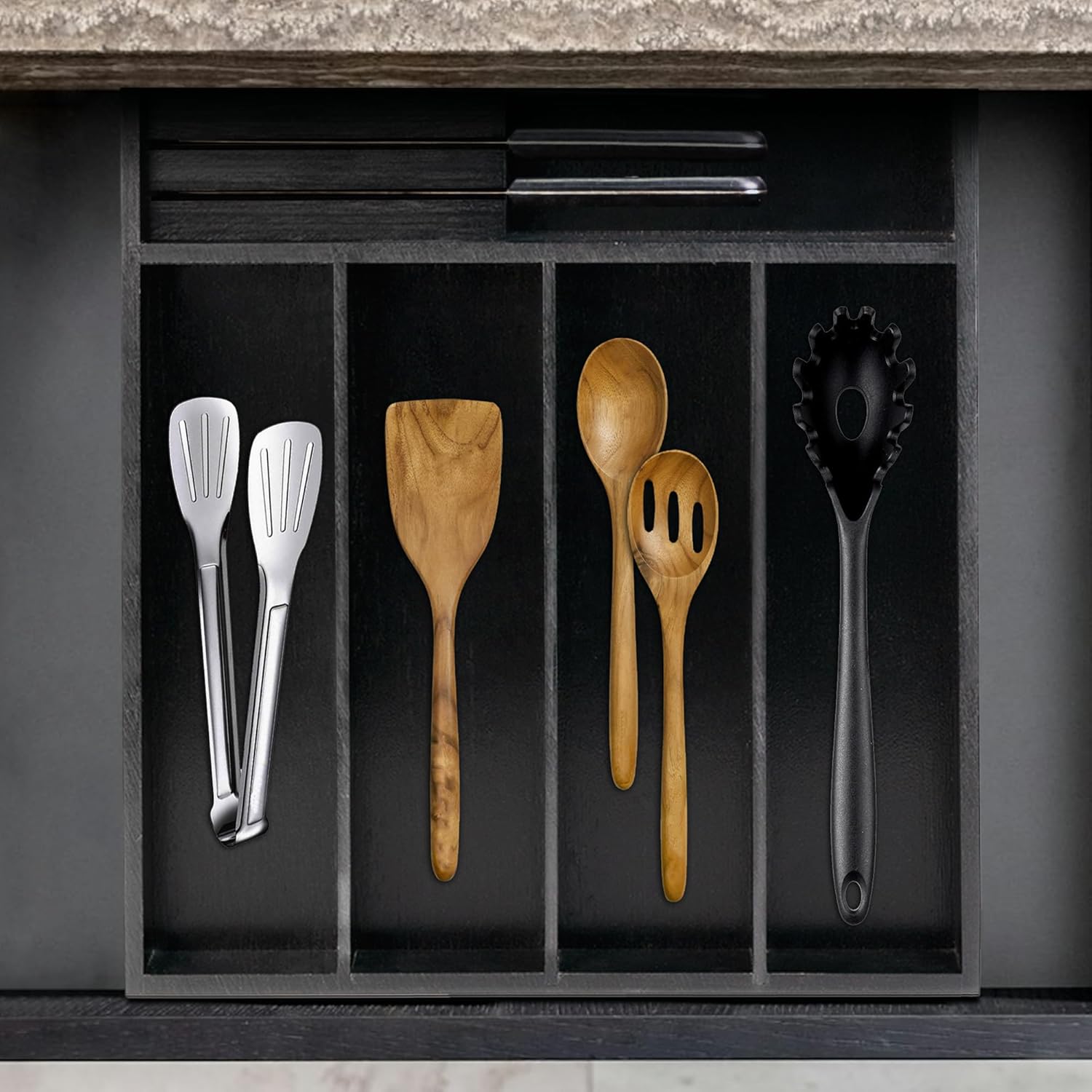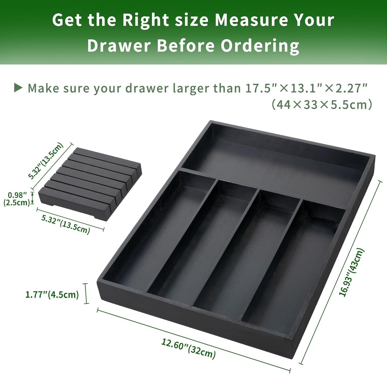 VaeFae Bamboo Silverware Organizer, Utensil Holder for Drawer, Wooden Cutlery Tray with Divider for Kitchen Drawer, Utensil Organizer with Knife Block(Black)
