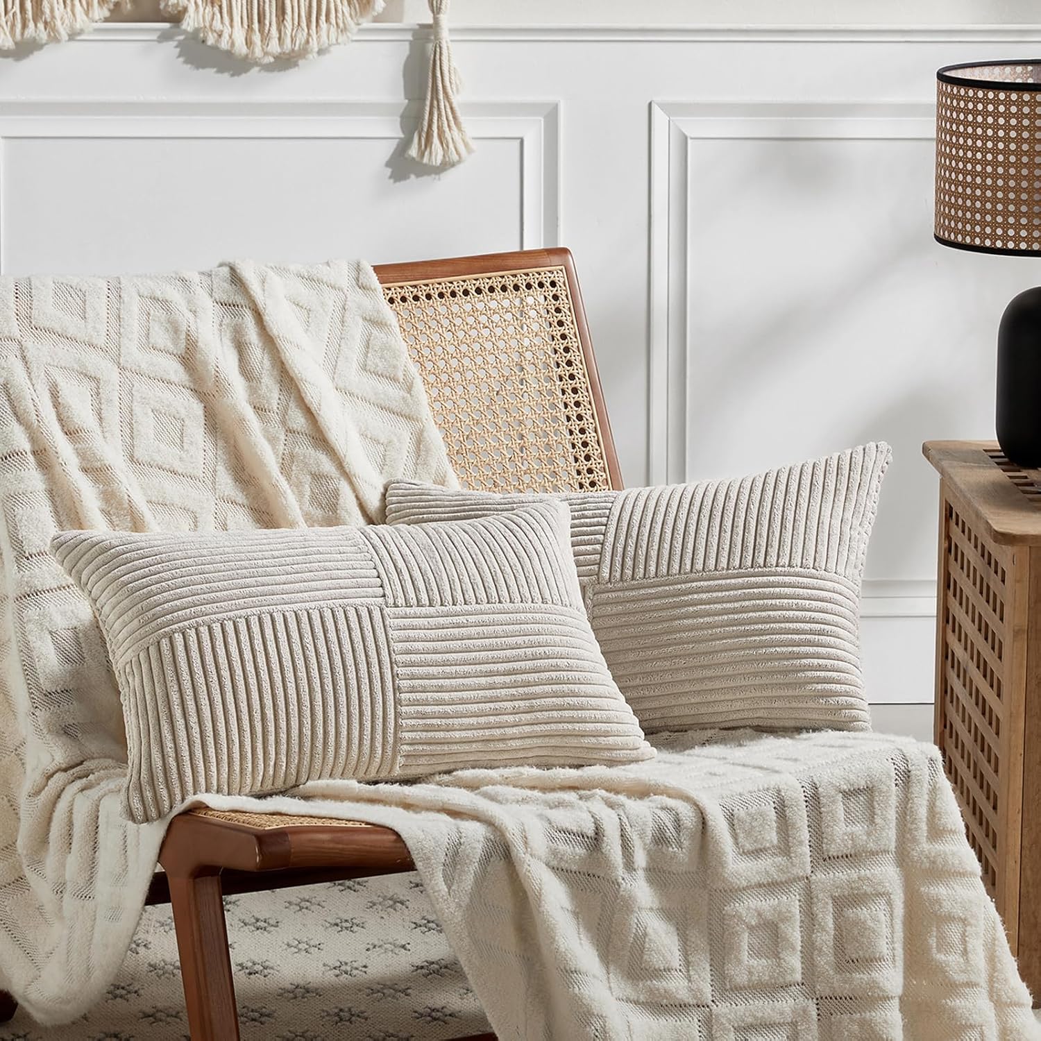 Fancy Homi 2 Packs Neutral Taupe Lumbar Decorative Throw Pillow Covers 12x20 Inch for Living Room Couch Bed Sofa, Farmhouse Home Decor, Soft Striped Corduroy Rectangle Accent Cushion Case 30x50 cm