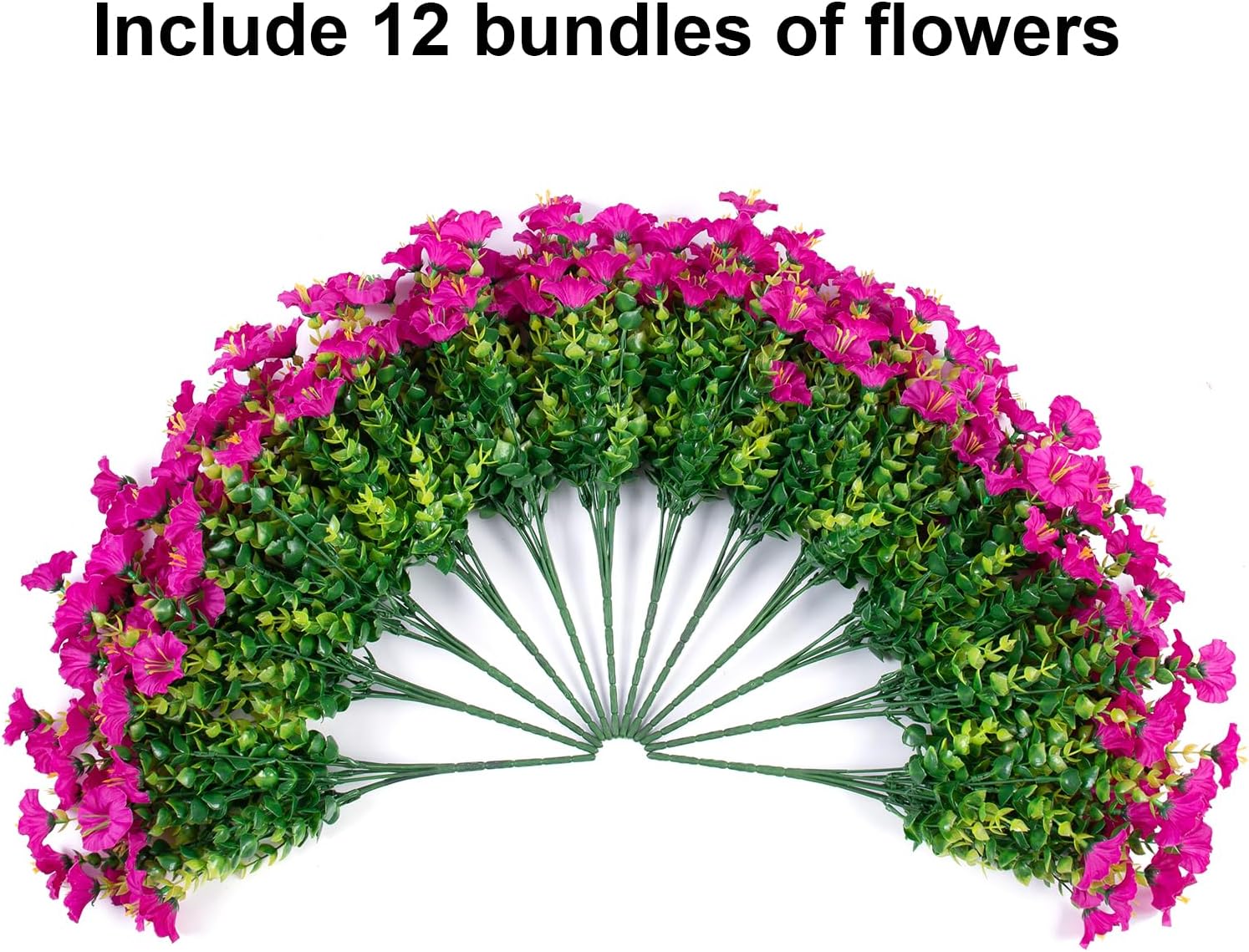 - Package Include: 12 bundles of artificial outdoor flowers fuchsia morning glory with green eucalyptus leaves. Pot not include.