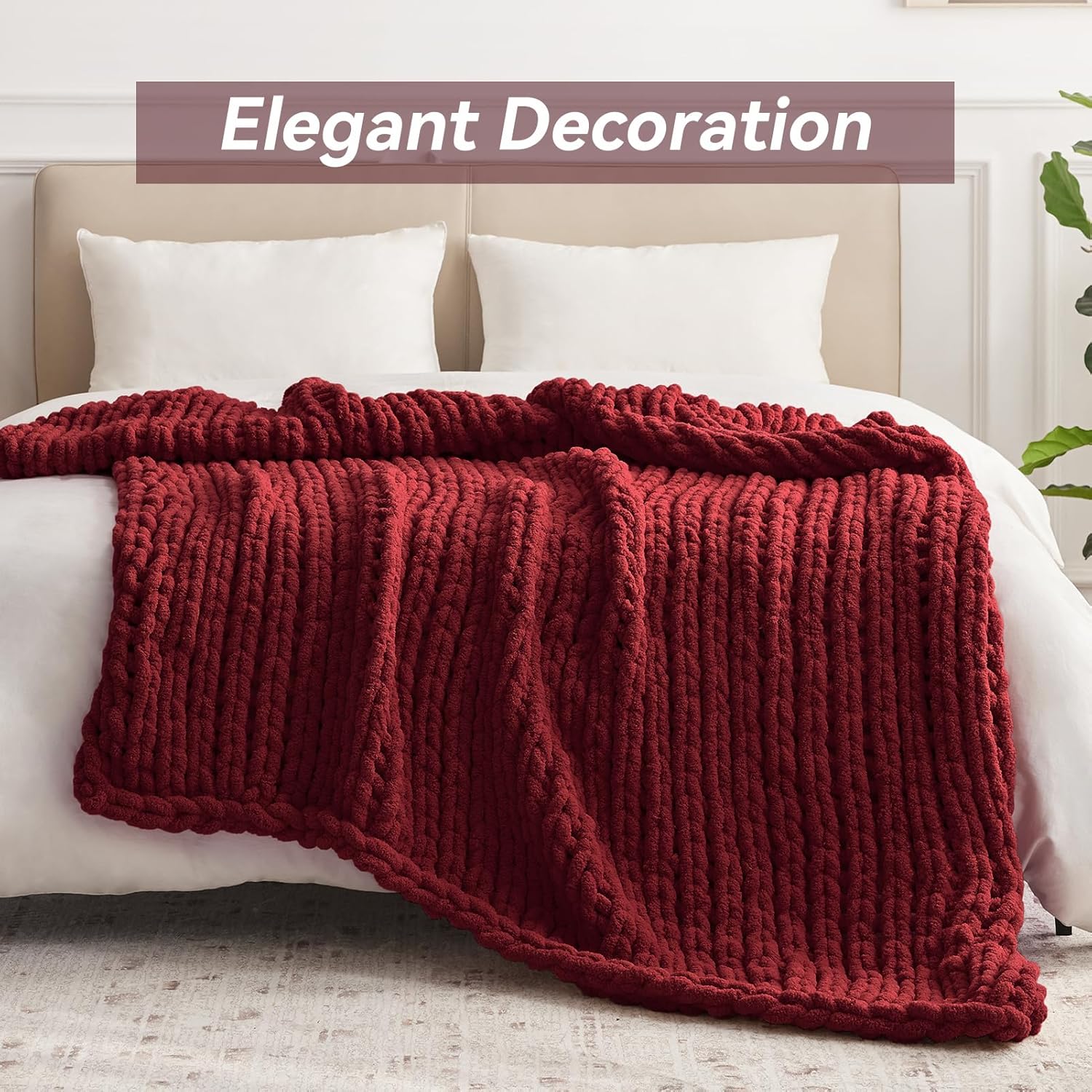Chunky Knit Throw Blanket, 30''*40'' Knitted Throw Chenille Yarn for Bed Couch, Handmade Red Crochet Big Thick Blanket, Machine Washable Cute Comfy Blanket for Home Decor