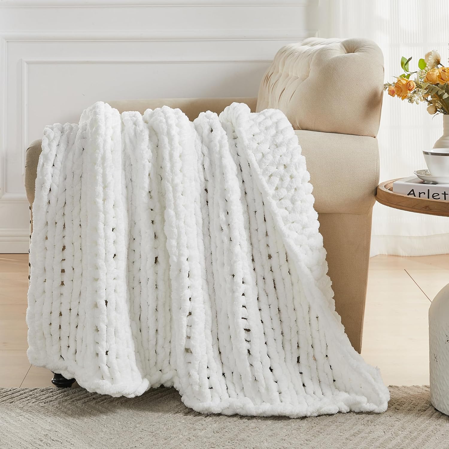 Carriediosa Chunky Knit Throw Blanket 60" X 80" Twin, 100% Hand Made Large Chenille Loop Yarn Soft Fluffy Throws for Couch Sofa Bed, Big Crochet Cozy Heavy Thick Cable Woven Blankets, Snow White