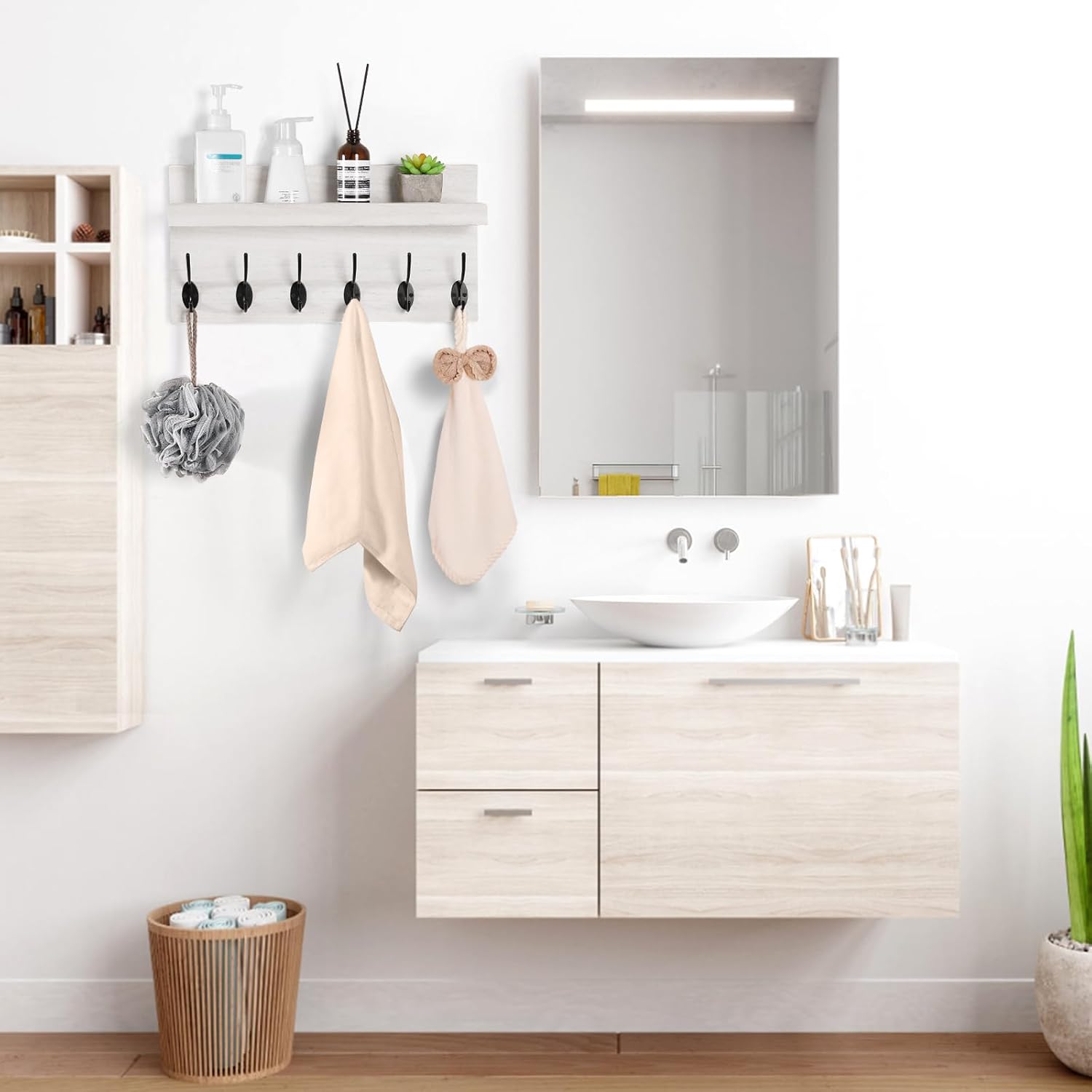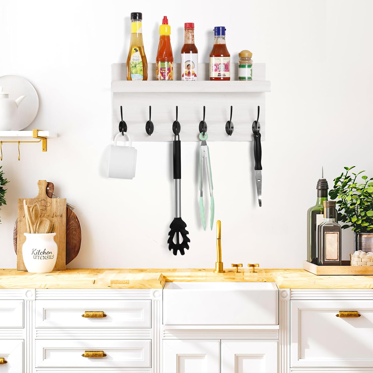 Shelf with Hooks, Coat Rack Wall Mount with 6 Double Metal Hooks, 17 Inch Farmhouse Wall Hooks with Shelf for Entryway, Bathroom, Kitchen, White