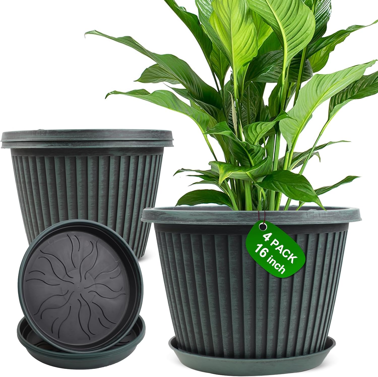 Large-Planter-Indoor-Outdoor Plant Pots, 16 inch 4 Pack Plastic Flower Pots with Saucer and Drainage Holes, Modern Garden Planters for Planting Medium Large Plants, Decorative Resin Garden Pots