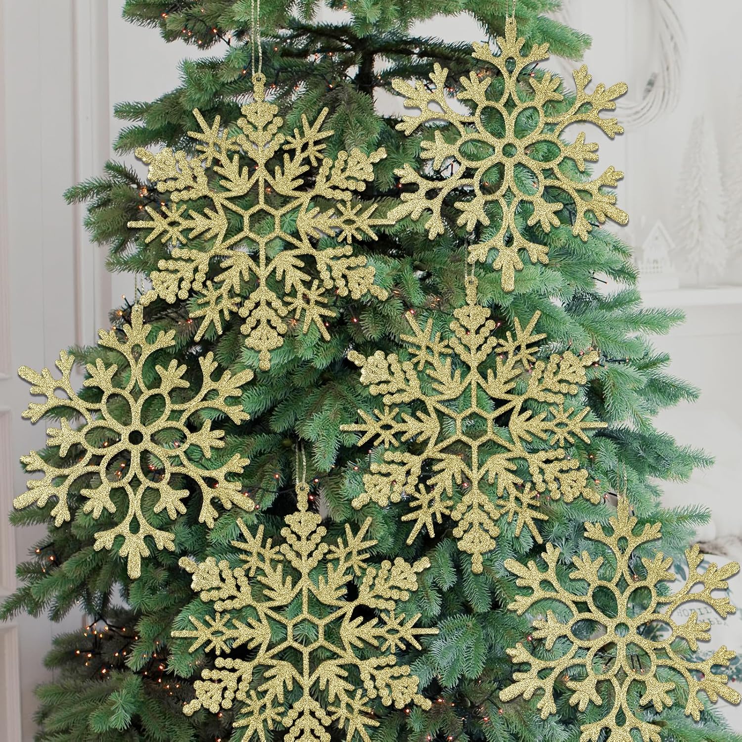 - STURDY BIG SNOWFLAKES: These gold snowflakes are well made of quality plastic with sparkly glitter scattered on them, stunning and reusable, able to stand up to bad weather outside and keep their shape well. Glitter attached closely and not easy to fall off, absolutely great Christmas decoration ornaments for years of use.