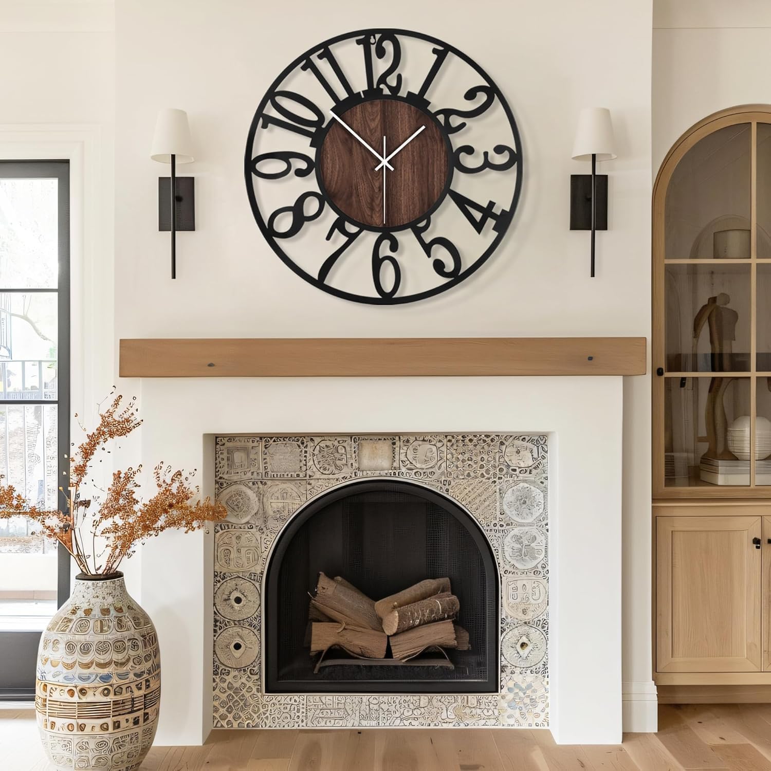 Maxstar Large Round Wall Clock for Living Room Decor Battery Operated Non Ticking Black Metal Wood Clocks for Home Living Room Garden Farmhouse Office Kitchen Decoration -24 inch