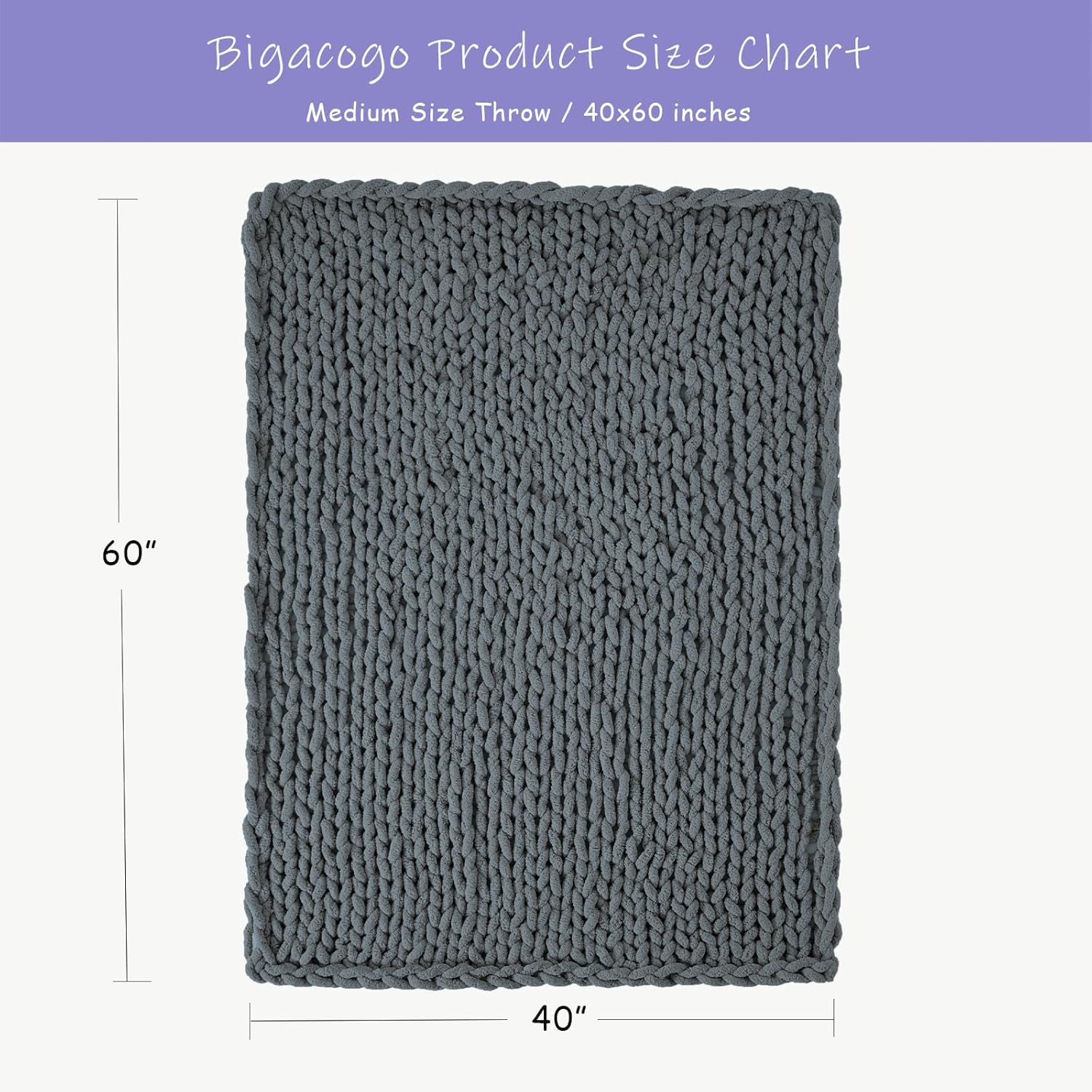 Bigacogo Chunky Knit Throw Blanket for Couch, 40x60 inches, 100% Hand Knitted with Thick Jumbo Chenille Yarn, Cozy Soft Large Rope Knot Cable Crochet Blankets for Sofa Bed Living Room, Iron Gray
