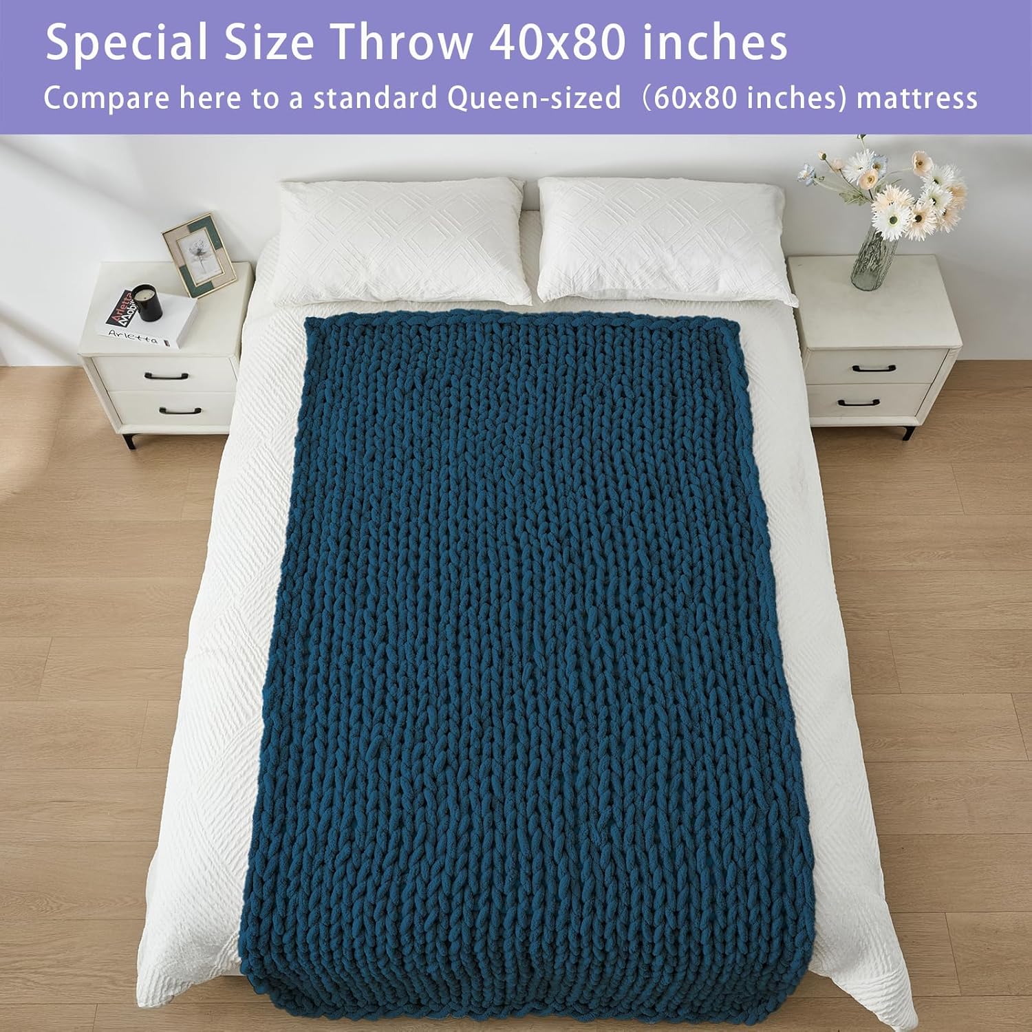 Bigacogo Chunky Knit Throw Blanket for Couch, 40x80 inches, 100% Hand Knitted with Thick Jumbo Chenille Yarn, Cozy Soft Large Rope Knot Cable Crochet Blankets for Sofa Bed Living Room, Deep Sea Blue