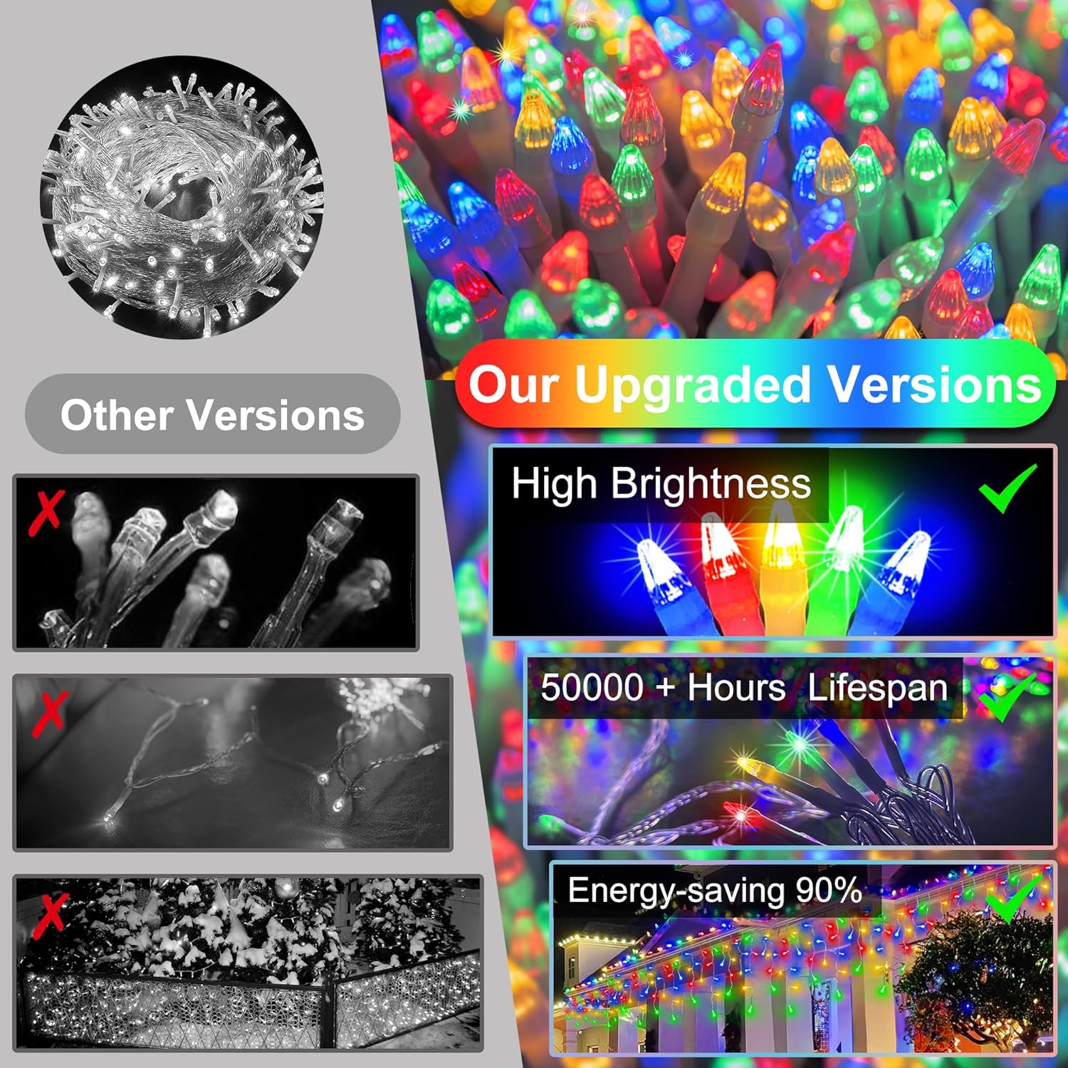 - Weather-Resistant Performance: Rated IP44 waterproof, our led christmas lights shine through rain, snow, and ice. Ideal for decorating exteriors, gardens, patios, or pergolas, they provide vibrant illumination for outdoor festivities and seasonal displays. Durable and reliable, they add a touch of modern elegance to any outdoor space, ensuring your celebrations sparkle all year round