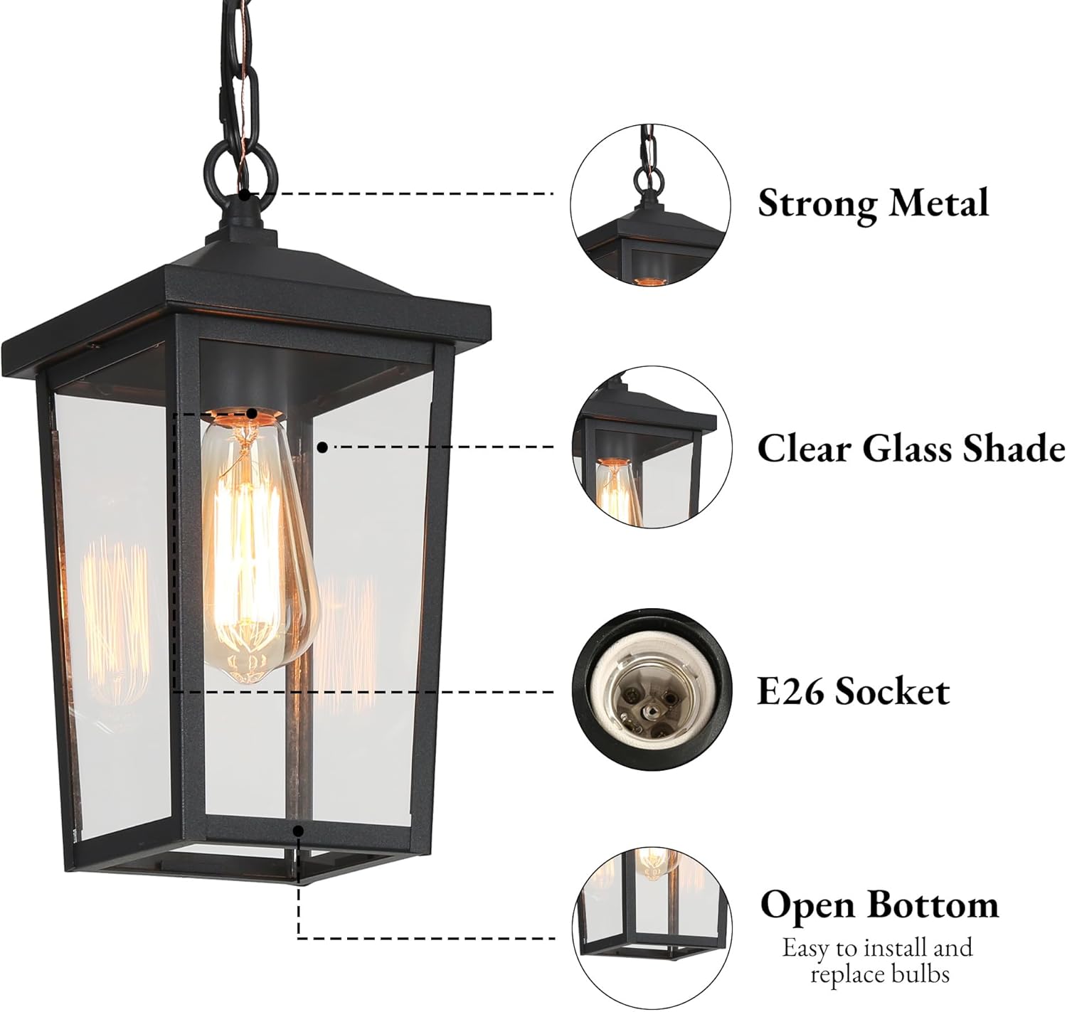 - Easy Installation & Bulb Requirement: Open bottom design for easy bulb replacement. Comes with an assembly kit and detailed user manual, and the exterior hanging lanterns can be installed easily. The outside light fixtures need 1 x Max 60W bulb with an E26 base. Compatible with LED, CFL, or Sensor Bulbs.