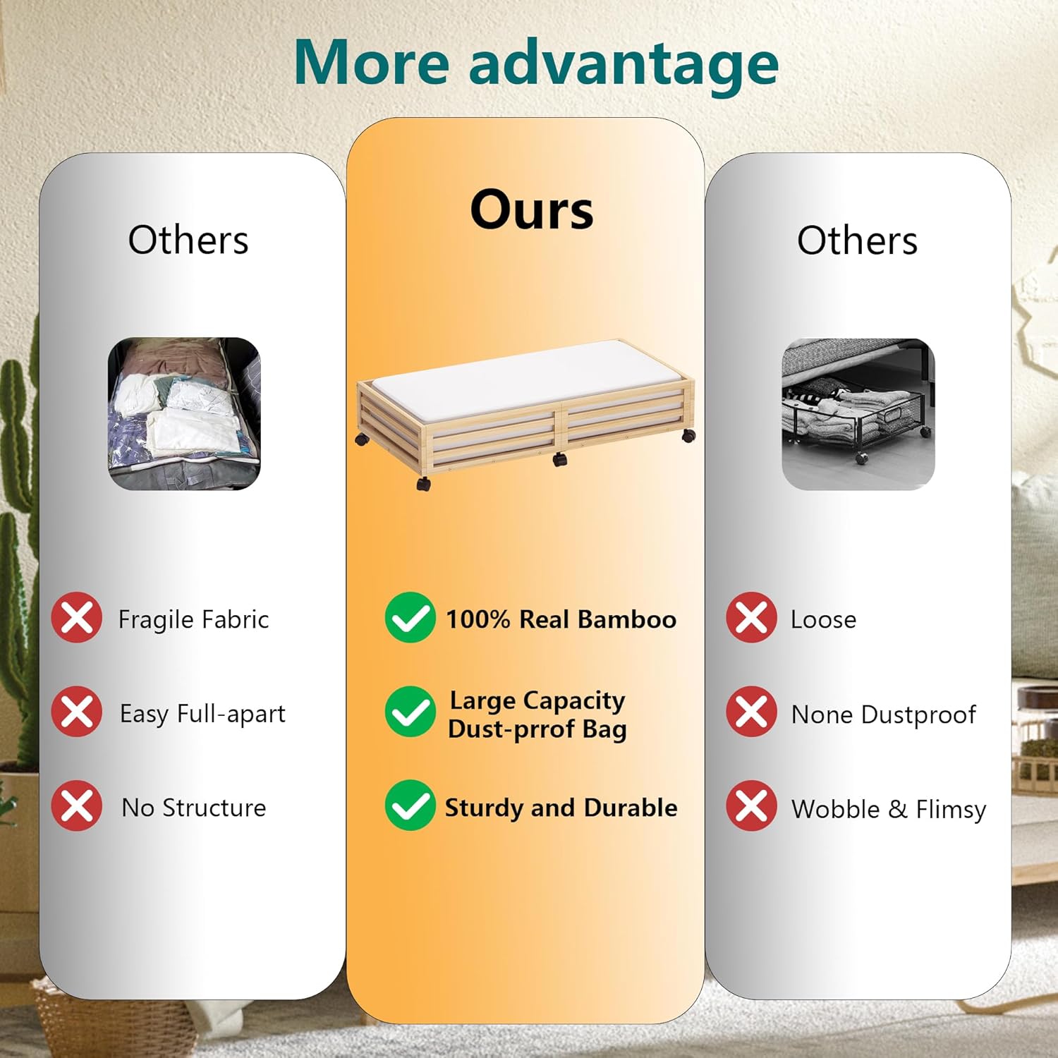 - 👍[Sturdy and Durable] Our under bed storage with wheels is crafted from premium wood bamboo, boasting 4 rotating wheels and a capacity of 120lbs. This 'under bed storage' solution includes non-woven bags for efficient organization of clothes, books, shoes, and toys.