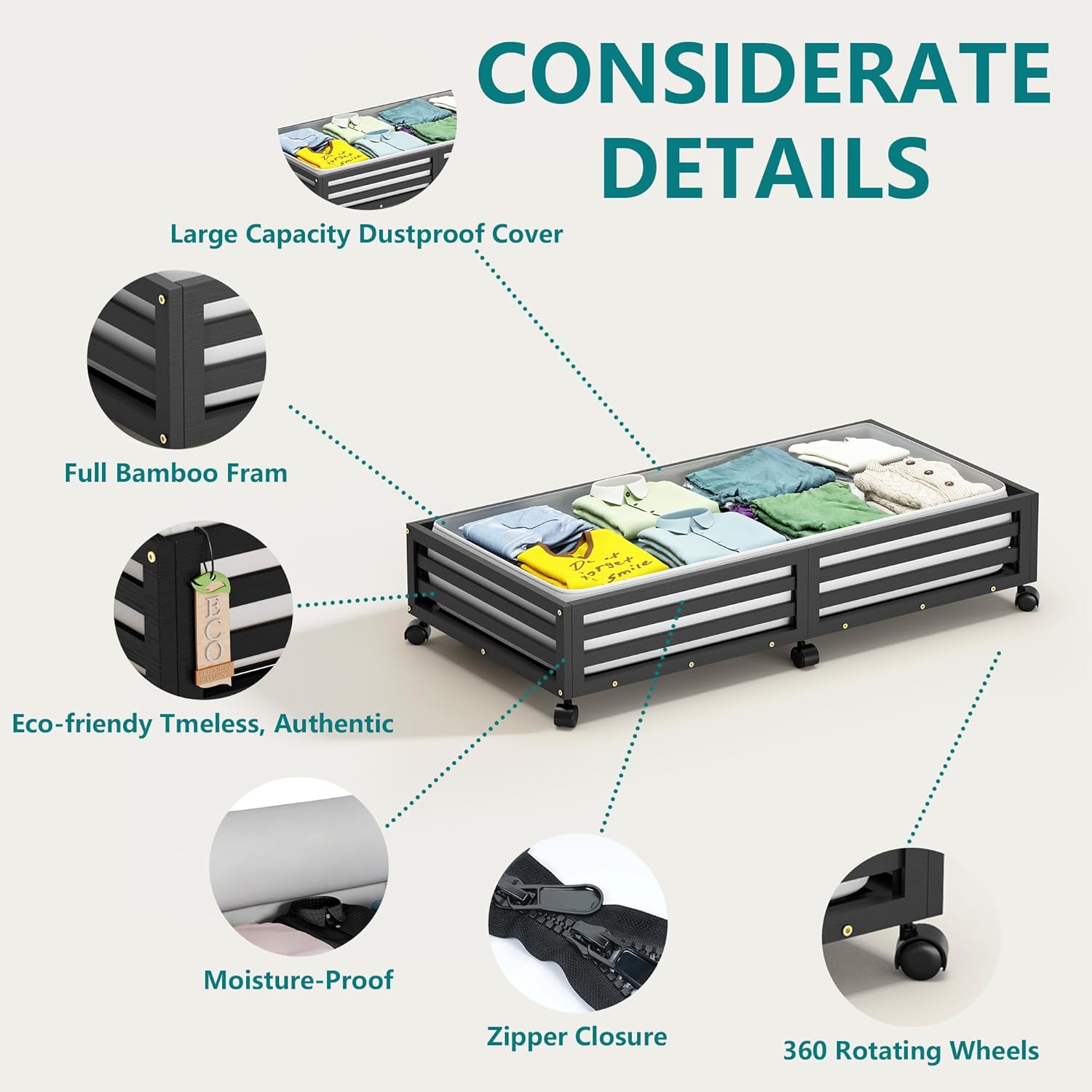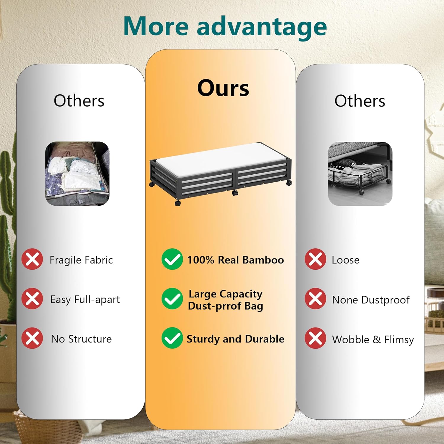- 👍[Sturdy and Durable] Our under bed storage with wheels is crafted from premium wood bamboo, boasting 4 rotating wheels and a capacity of 120lbs. This 'under bed storage' solution includes non-woven bags for efficient organization of clothes, books, shoes, and toys.
