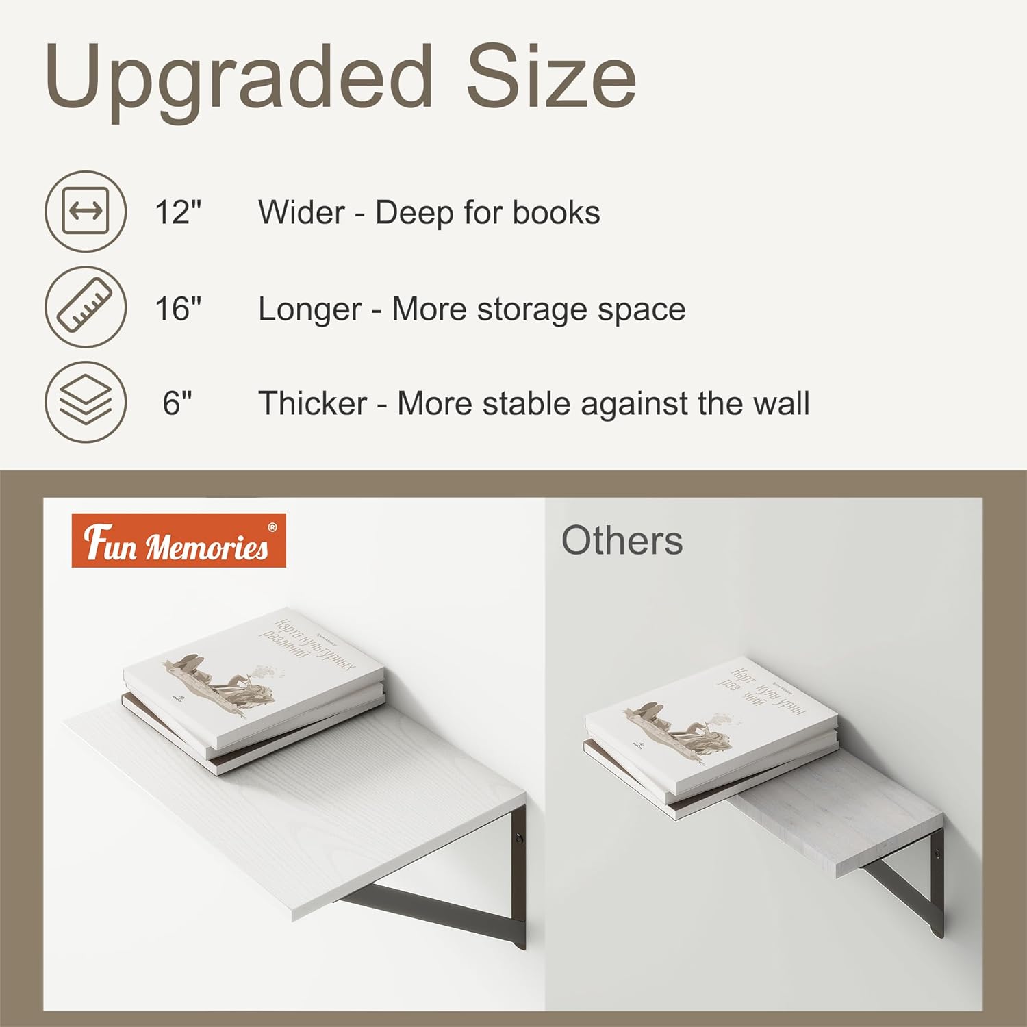 - 【12 INCH DEEP FLOATING SHELF】This extra deeper and wider wall shelves are 12 inches in depth and 16 inches in length instead of the regular narrow floating shelves, you can put photos, pictures, DVD players, videos, books, toys, and some other knickknack on this beautiful display wooden shelf.