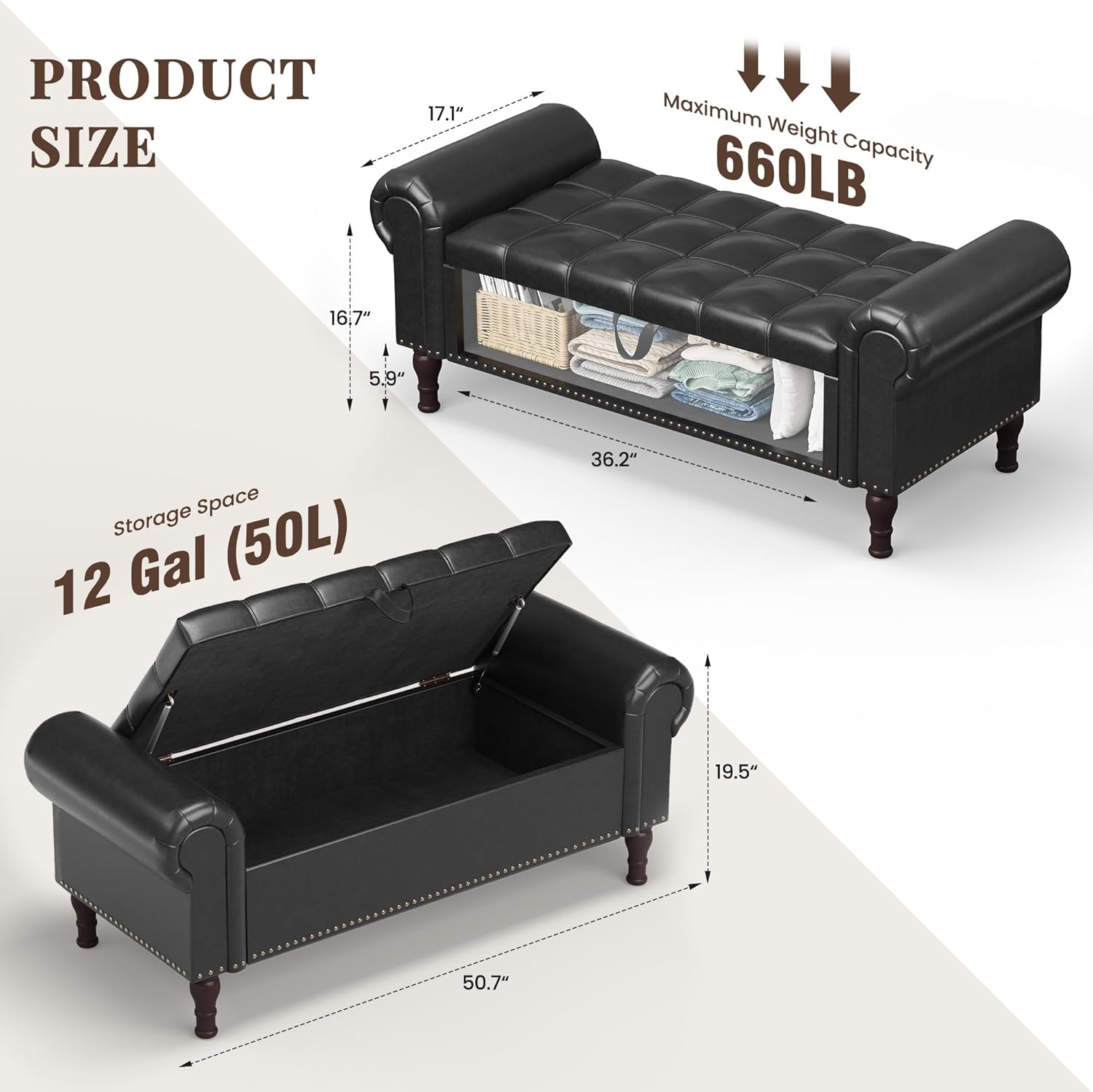 Storage Ottoman Bench for Bedroom, 51" Upholstered Bedroom Bench with Rolled Arms and Vintage Rivets, Large Storage Chest for Living Room, Bedroom, Entryway, Black