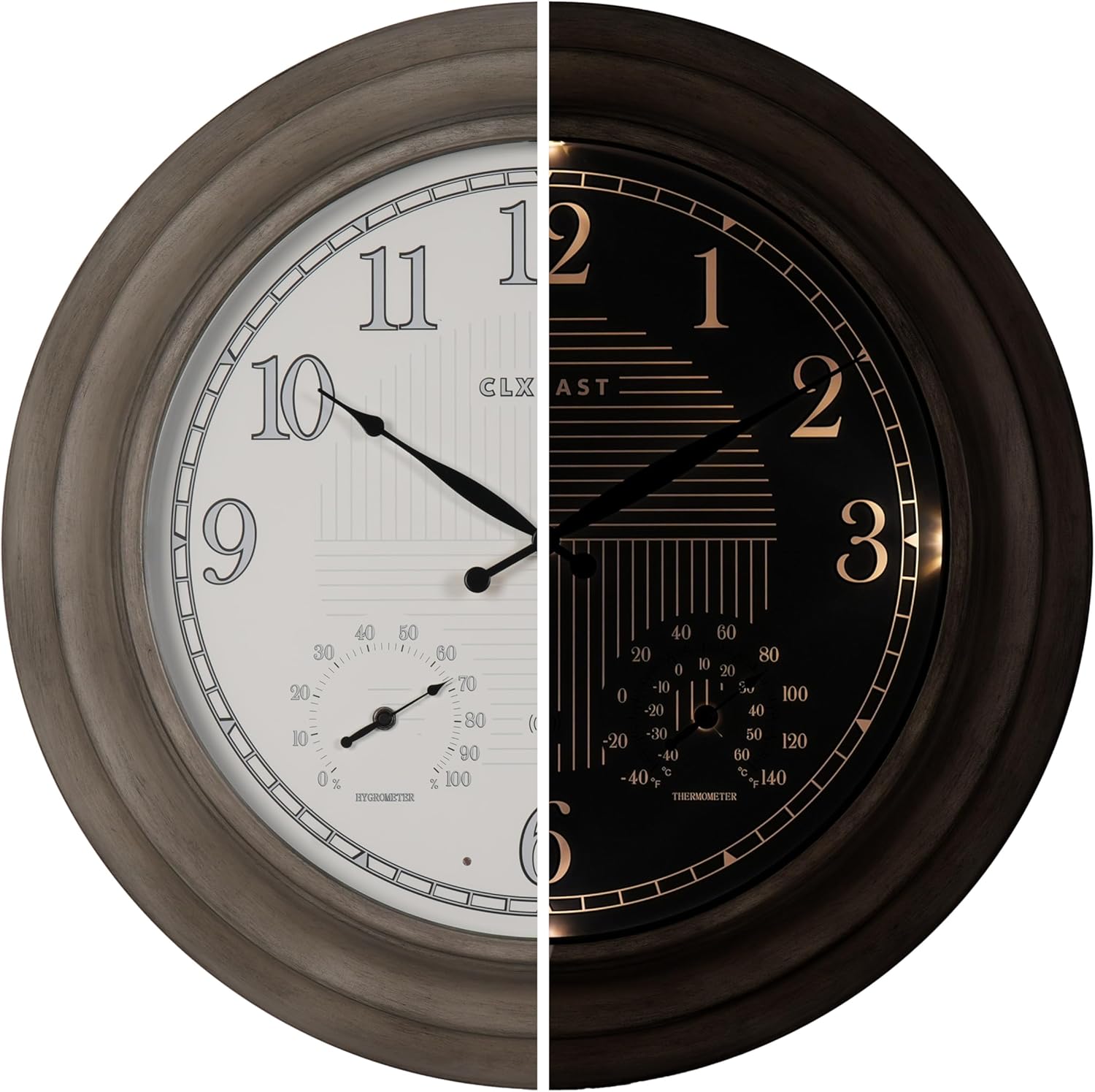 CLXEAST 24 Inch Self-Illuminated in/Outdoor Atomic Wall Clock with Temperature and Humidity, Oversized Large 24 Inch Wall Clocks for Living Room Decor, Brushed Grey Oak Wooden Finish