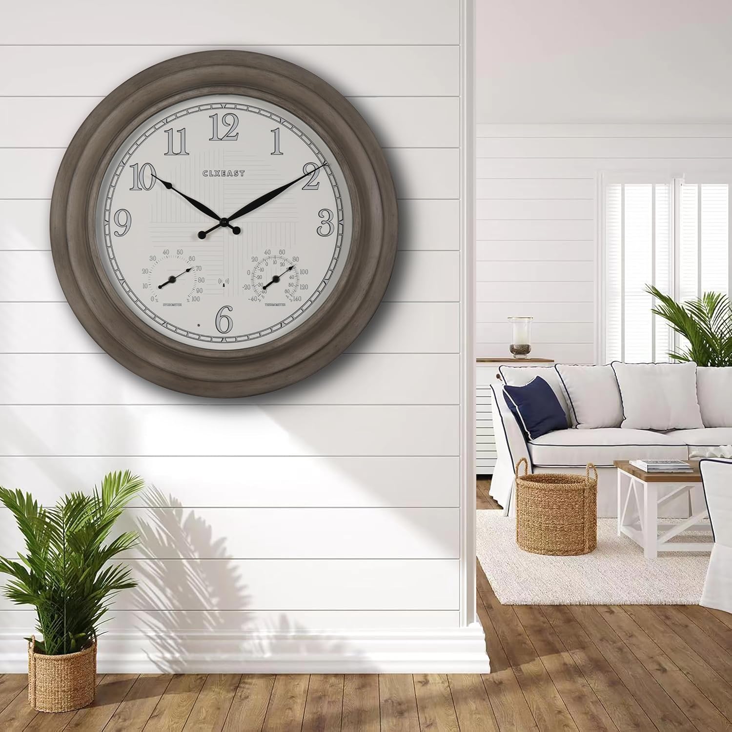 - 【IP65 Waterproof Outdoor/Indoor Atomic Wall Clock]-This hand brushed grey oak/faux barnwood 24 Inch oversized large outdoor clock is UV resistant& weatherproof,sealed with front and back rubberized gasket for protection from water and other outdoor elements.An elegant timepiece for your outdoor garden,pool, patio or backyard,porch,modern farmhouse living room,dinning room,bathroom,kitchen,fireplace,entryway,home office