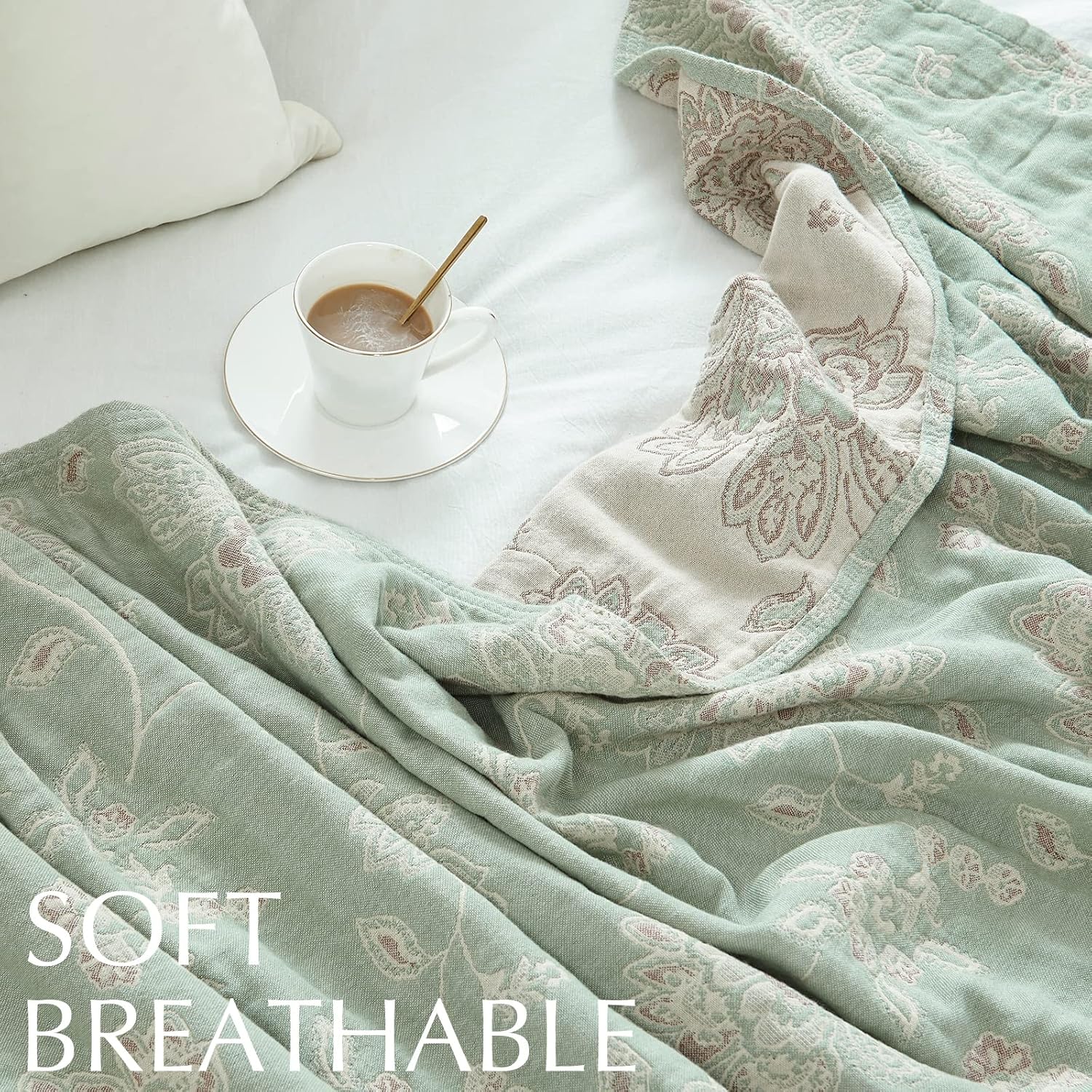 jinchan Boho 100% Cotton Muslin Queen Size 80x90 Inches Blanket Lightweight 4-Layer Quilted Soft Green and Beige Floral Throw Blanket Reversible Comfy Flower Rustic All Seasons Couch Bedroom Decor